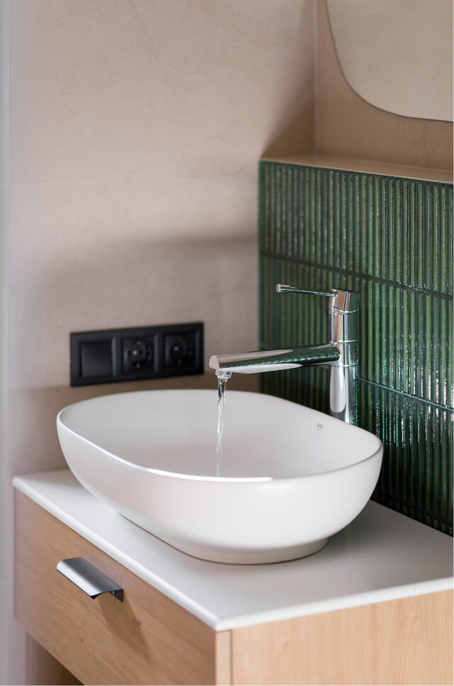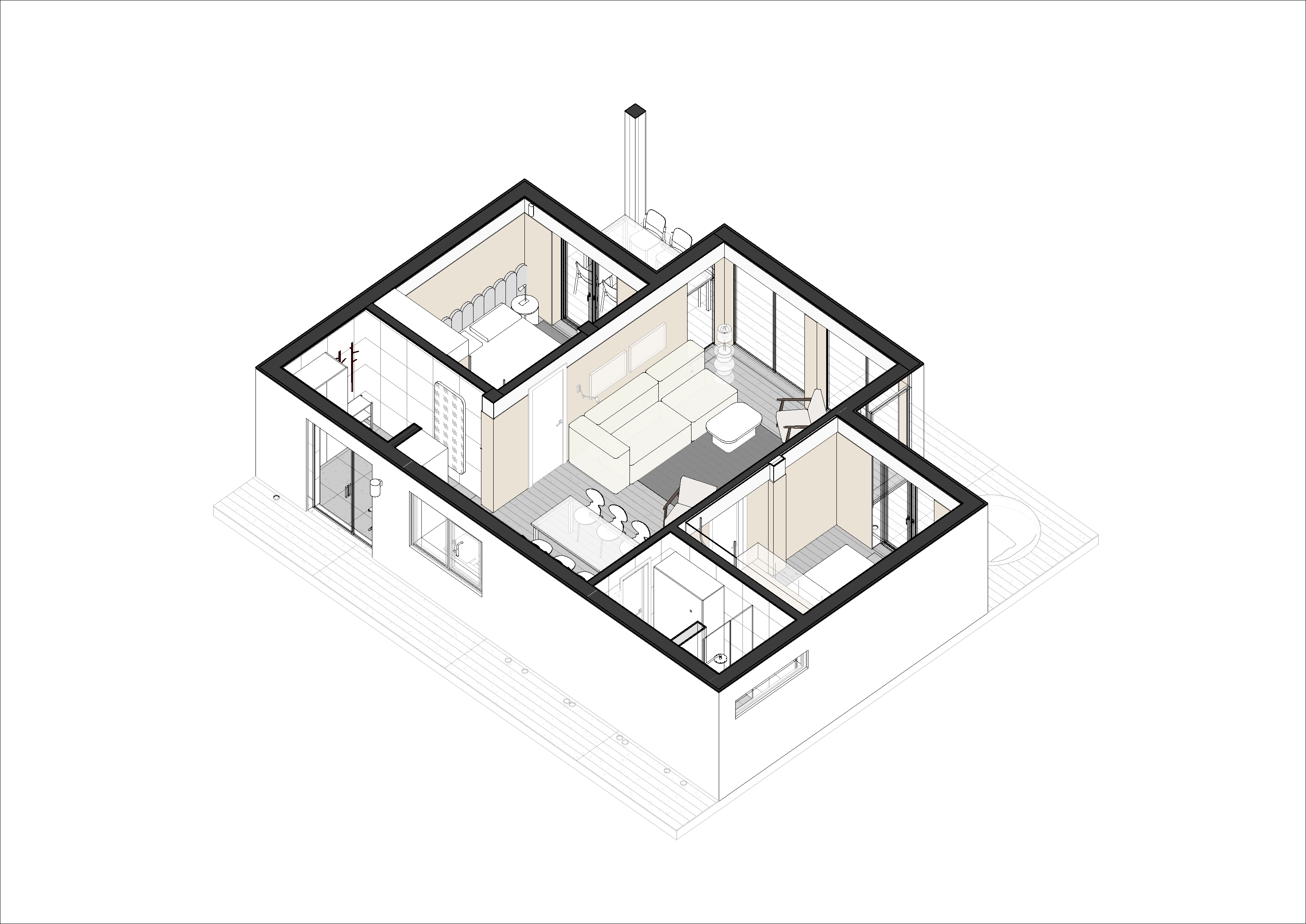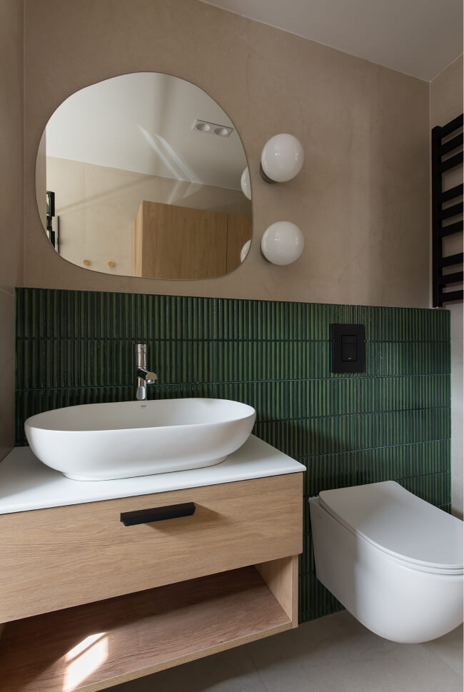 У вбиральню будиночку інтегровані сучасні деталі: раковина, дзеркало, душова, унітаз, шафа з технікою (бойлер, пральна машина) і сушарка для рушників створюють зручний простір. Вікно додає природного світла, що робить кімнату ще більш привабливою. Використані матеріали, такі як плитка від WOW Sweet Bars, забезпечують естетичність та довговічність.