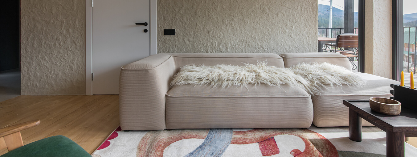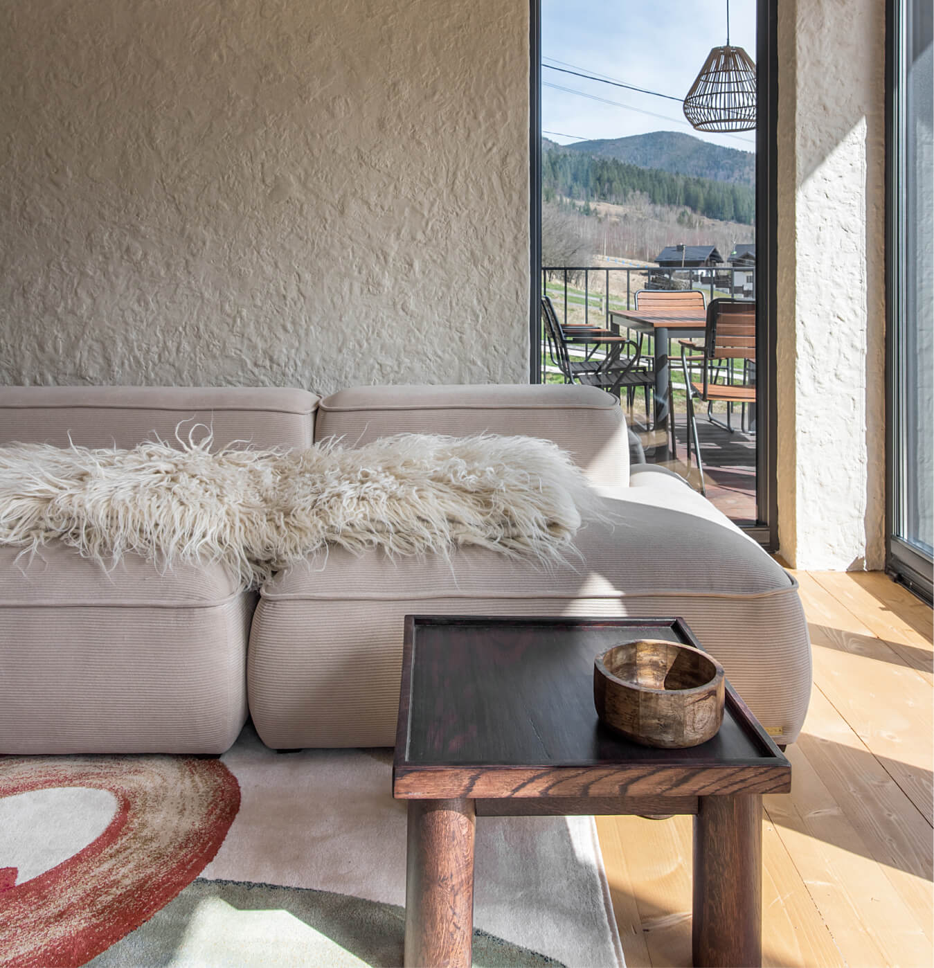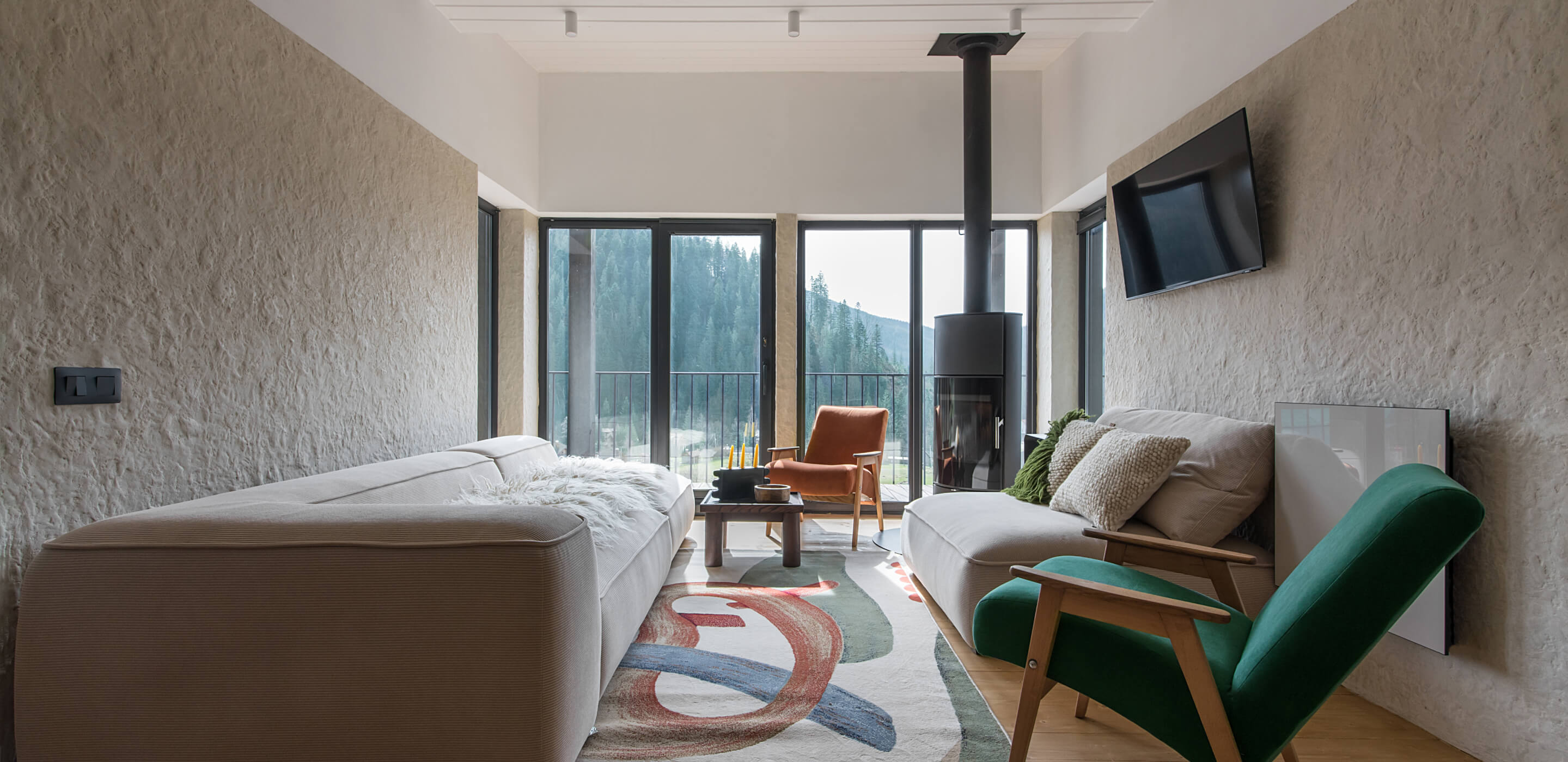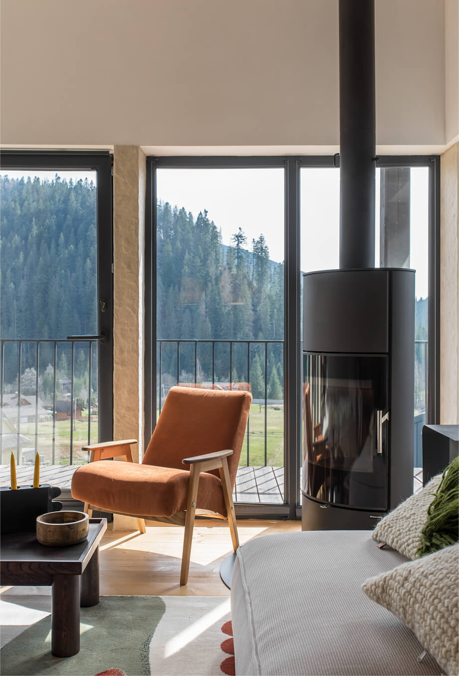 Вітальня Gont — це простір для відпочинку і милування природою. Великі вікна відкривають вид на Карпати, що стає природним декором. Модульний кутовий диван, вінтажні крісла, столик з натурального дуба зроблений із пуфу від бренду GUSHKA, яким можна користуватися, знявши подушку, дерев’яні вази від Tvoї Studio та килим від KononenkoID створюють домашню атмосферу. Килим, символічно створений під час війни, додає глибини і історії простору.