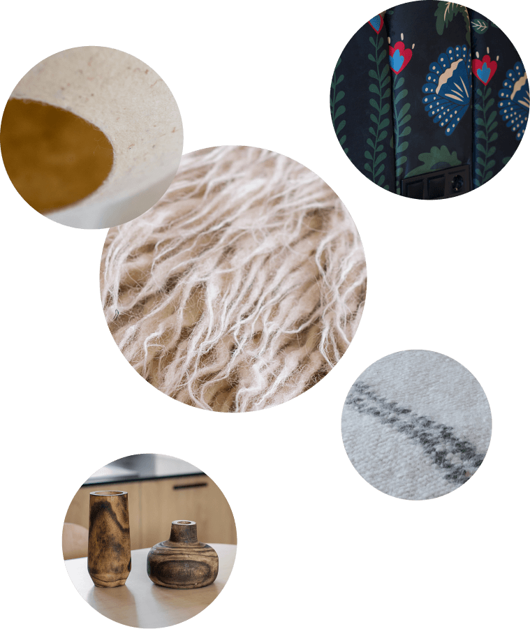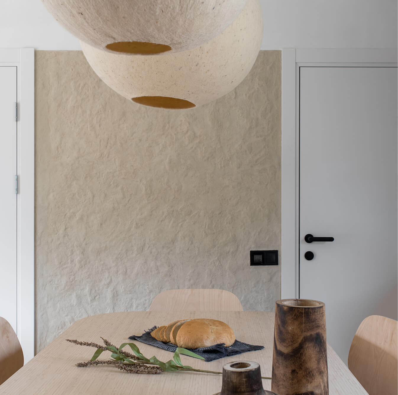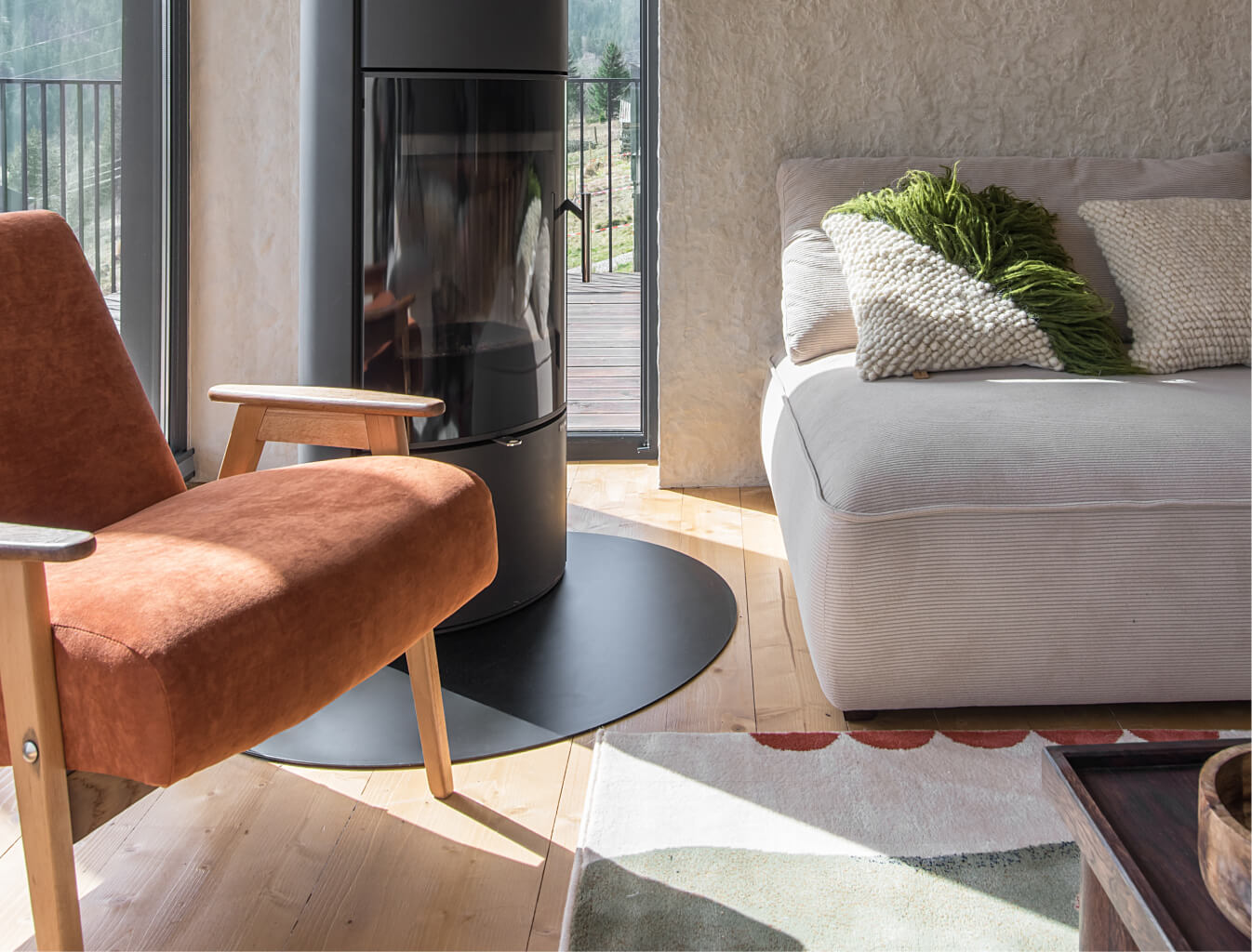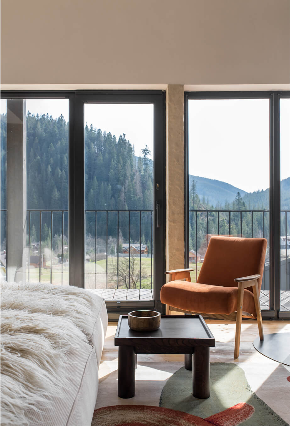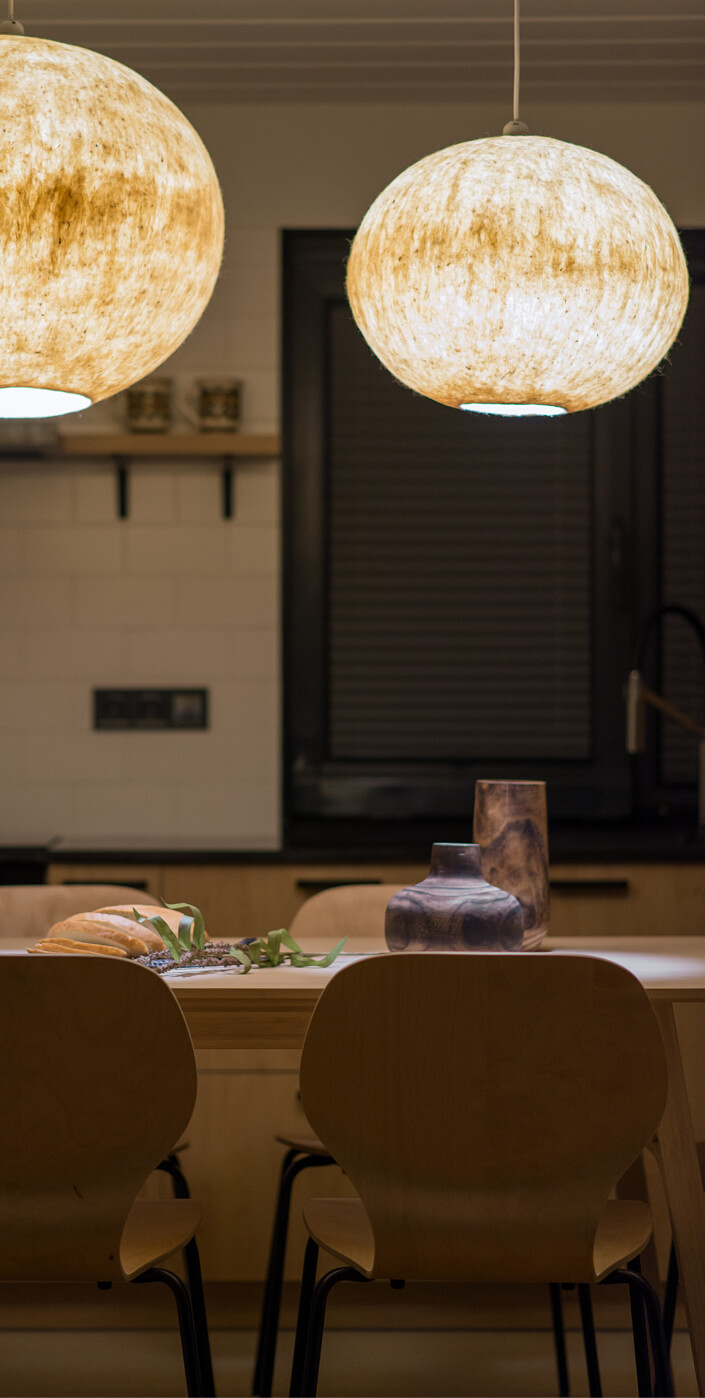 Вітальня Gont — це простір для відпочинку і милування природою. Великі вікна відкривають вид на Карпати, що стає природним декором. Модульний кутовий диван, вінтажні крісла, столик з натурального дуба зроблений із пуфу від бренду GUSHKA, яким можна користуватися, знявши подушку, дерев’яні вази від Tvoї Studio та килим від KononenkoID створюють домашню атмосферу. Килим, символічно створений під час війни, додає глибини і історії простору.