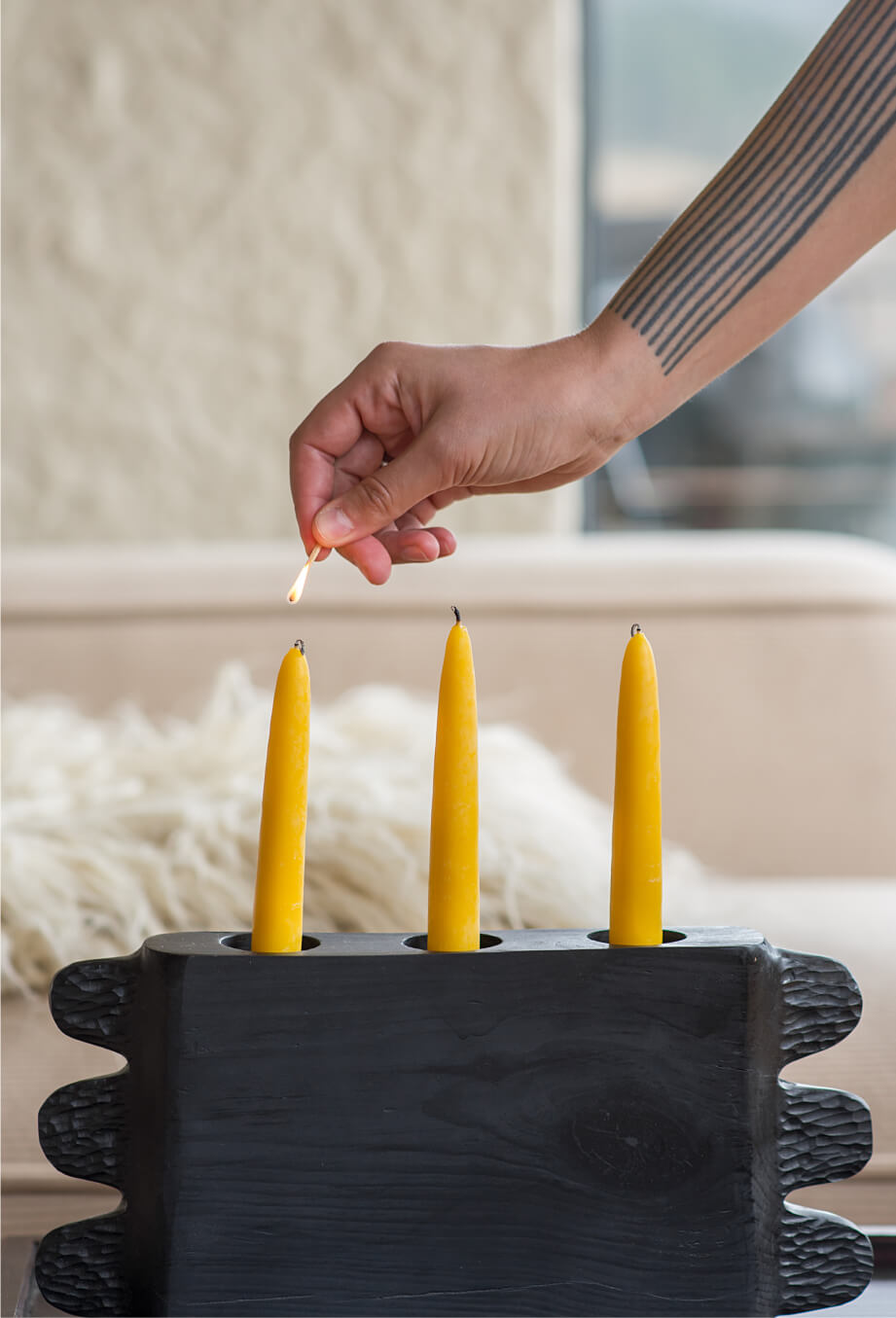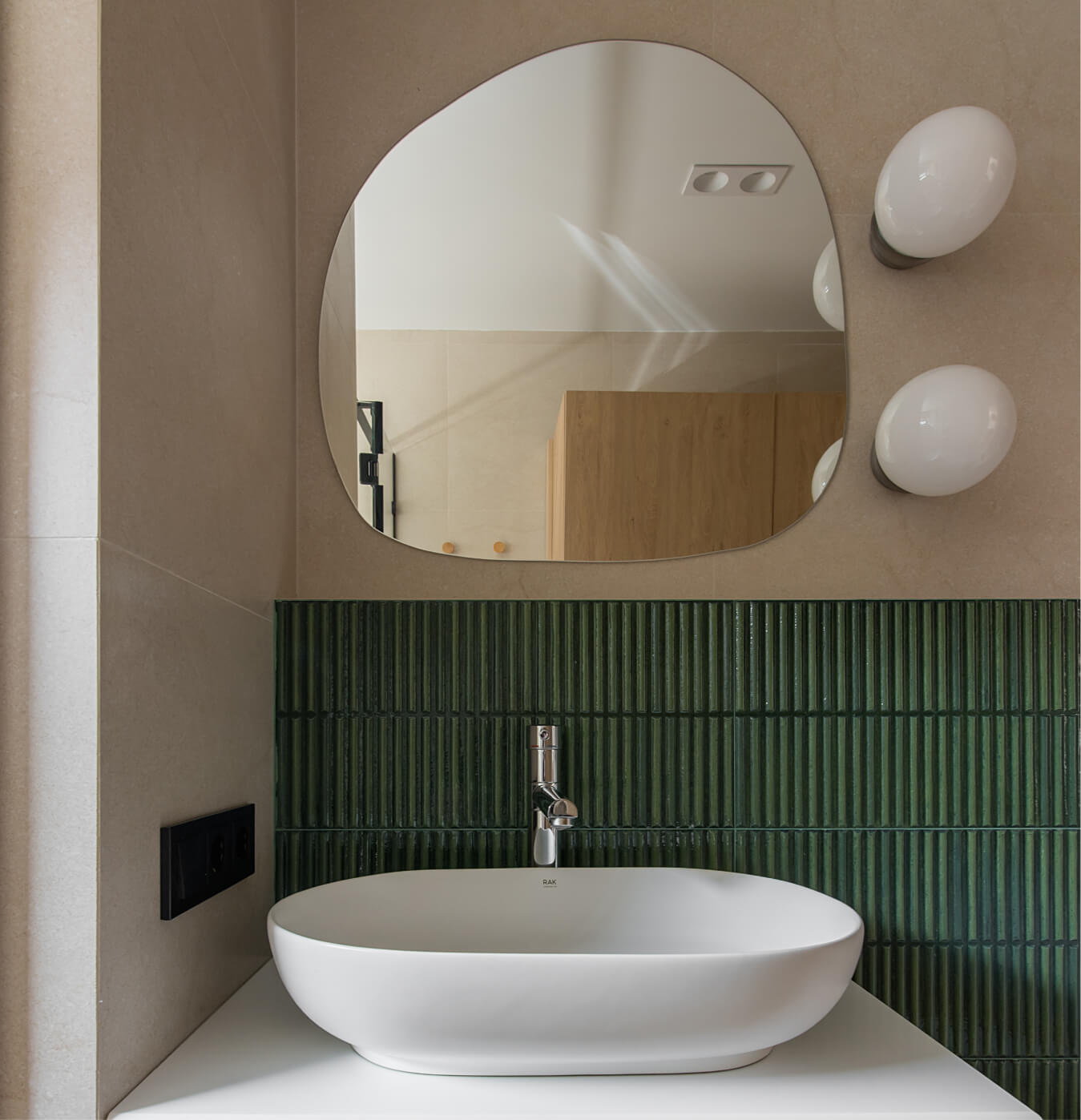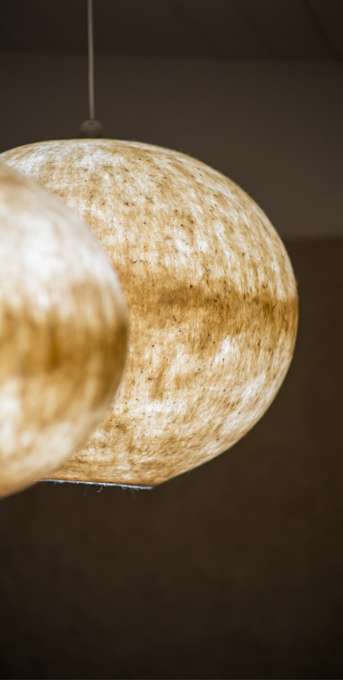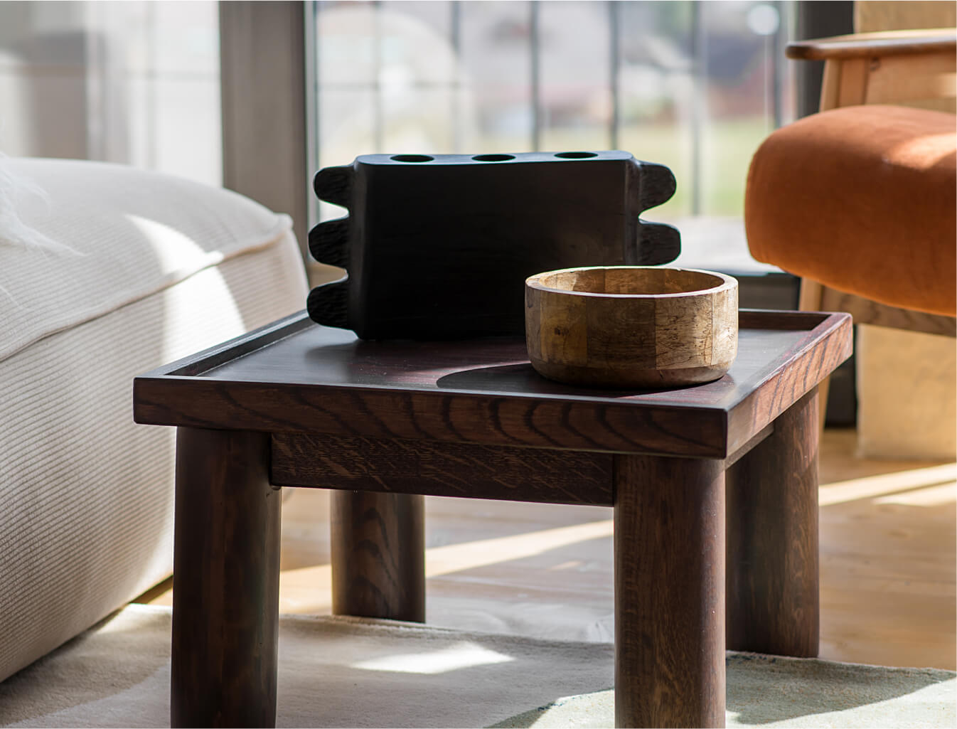 Вітальня Gont — це простір для відпочинку і милування природою. Великі вікна відкривають вид на Карпати, що стає природним декором. Модульний кутовий диван, вінтажні крісла, столик з натурального дуба зроблений із пуфу від бренду GUSHKA, яким можна користуватися, знявши подушку, дерев’яні вази від Tvoї Studio та килим від KononenkoID створюють домашню атмосферу. Килим, символічно створений під час війни, додає глибини і історії простору.