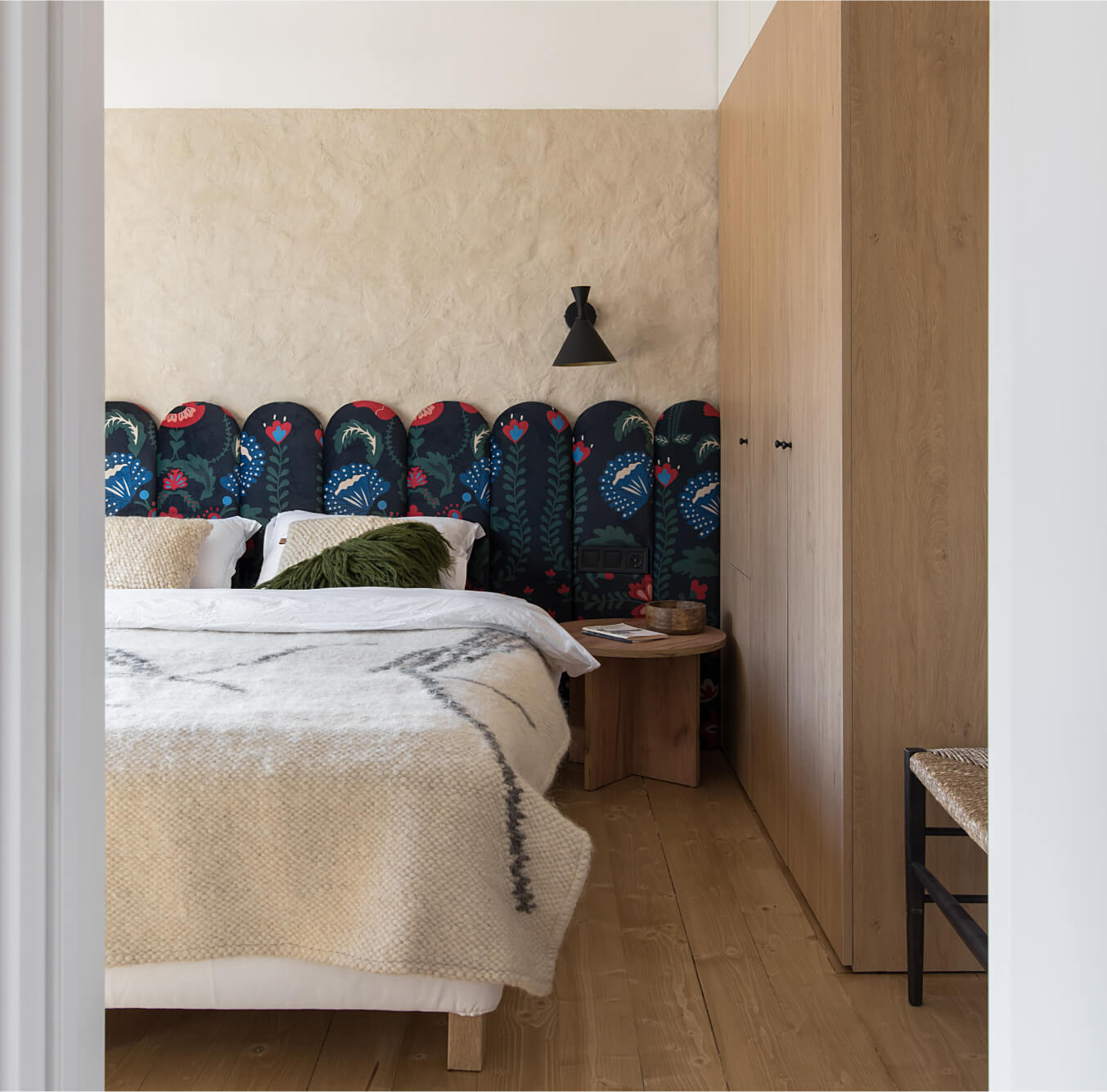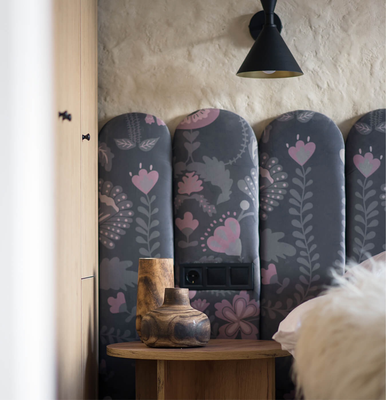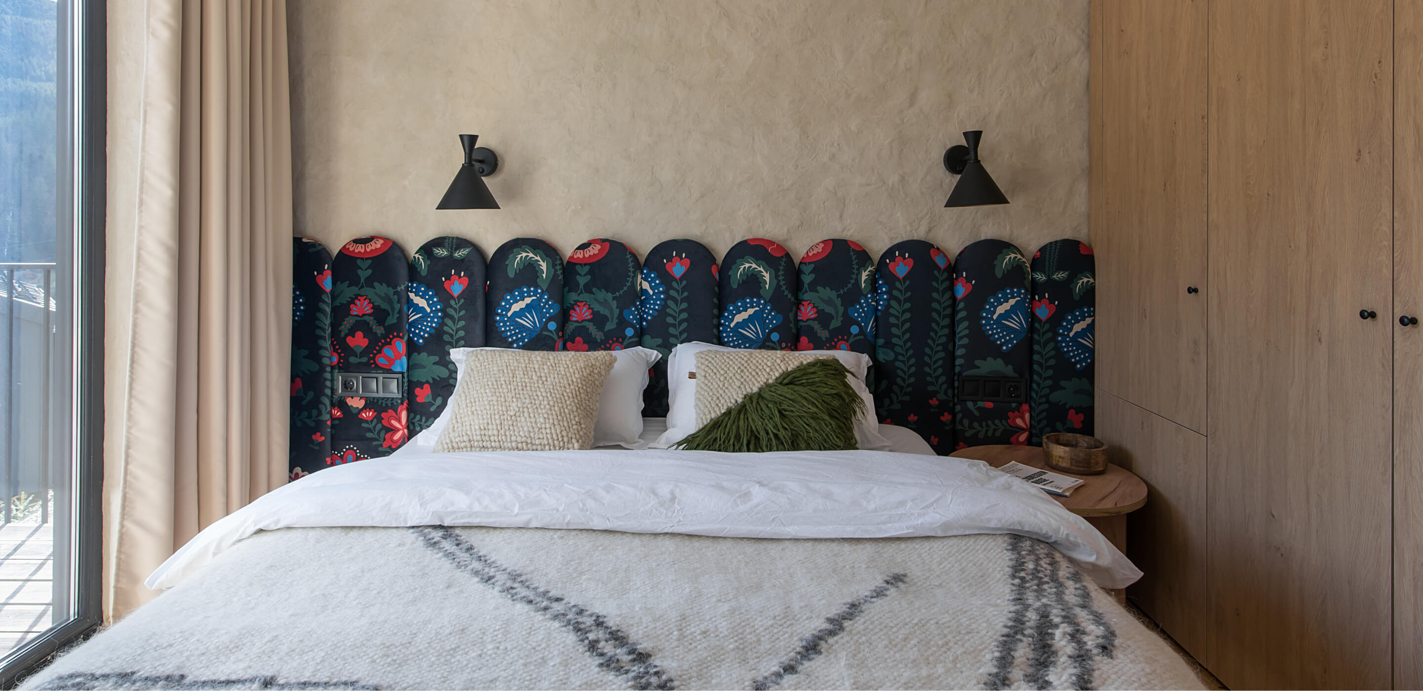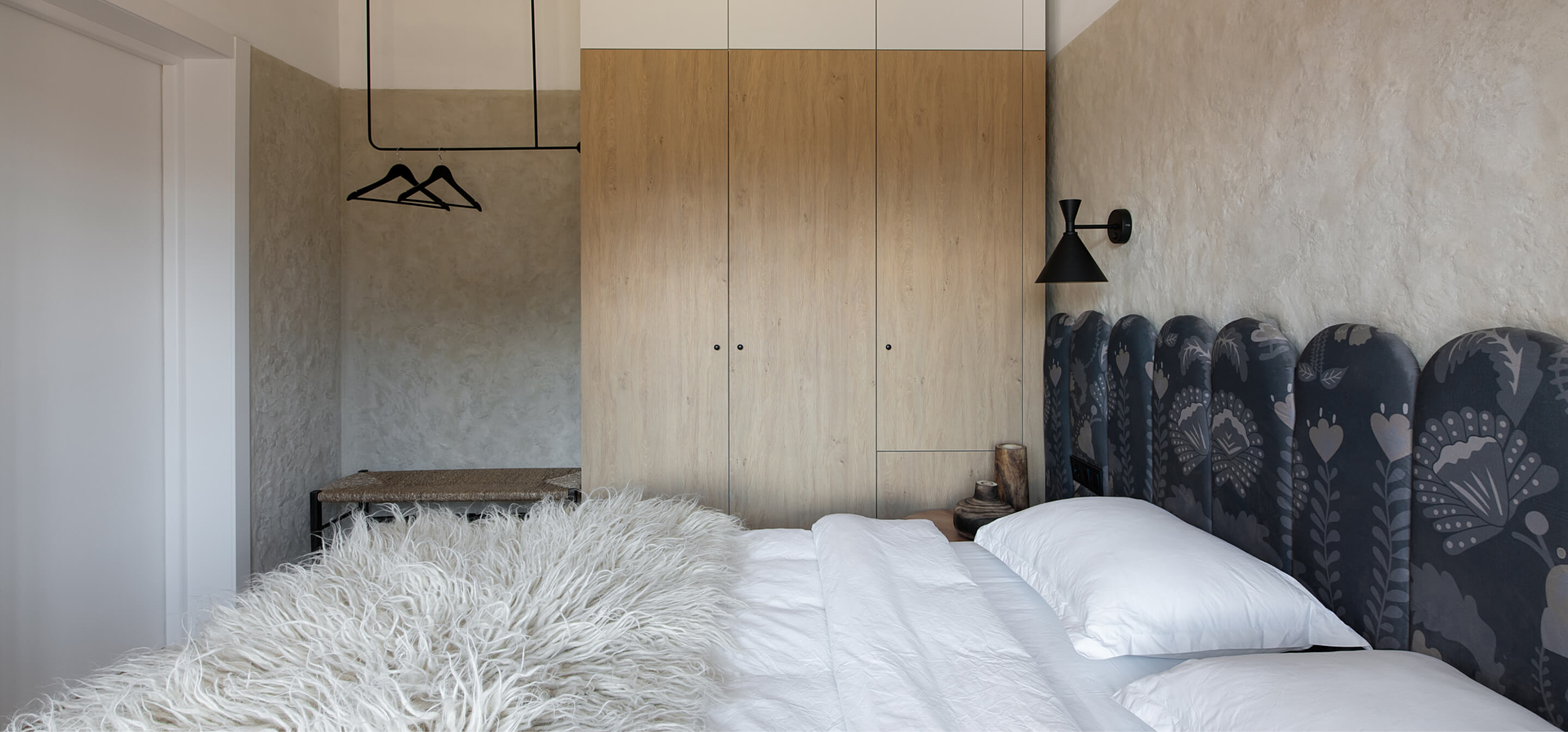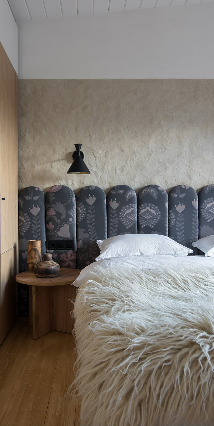 Спальня в Gont створена для відпочинку і відновлення. Двоспальні ліжка з дизайнерськими узголів'ями, шафи для речей, лавка FDB Møbler, вішалки, приліжкові столики, бра і штори забезпечують комфорт і функціональність. Для підсилення затишку ми обрали такі українські бренди домашнього декору, як подушки GUSHKA та килим Basny Rugs. У спальні відчувається безпека і спокій, особливо важливі в сучасних умовах.