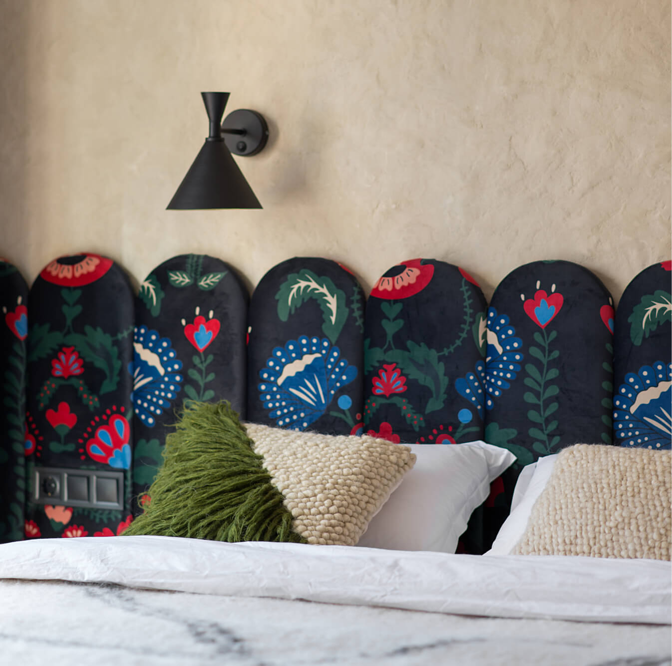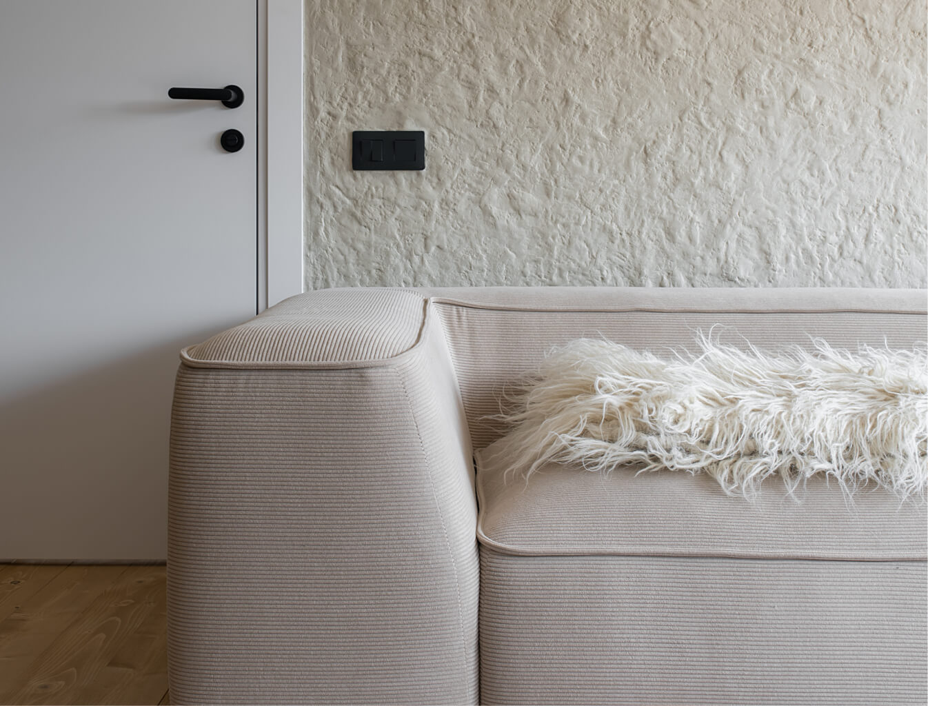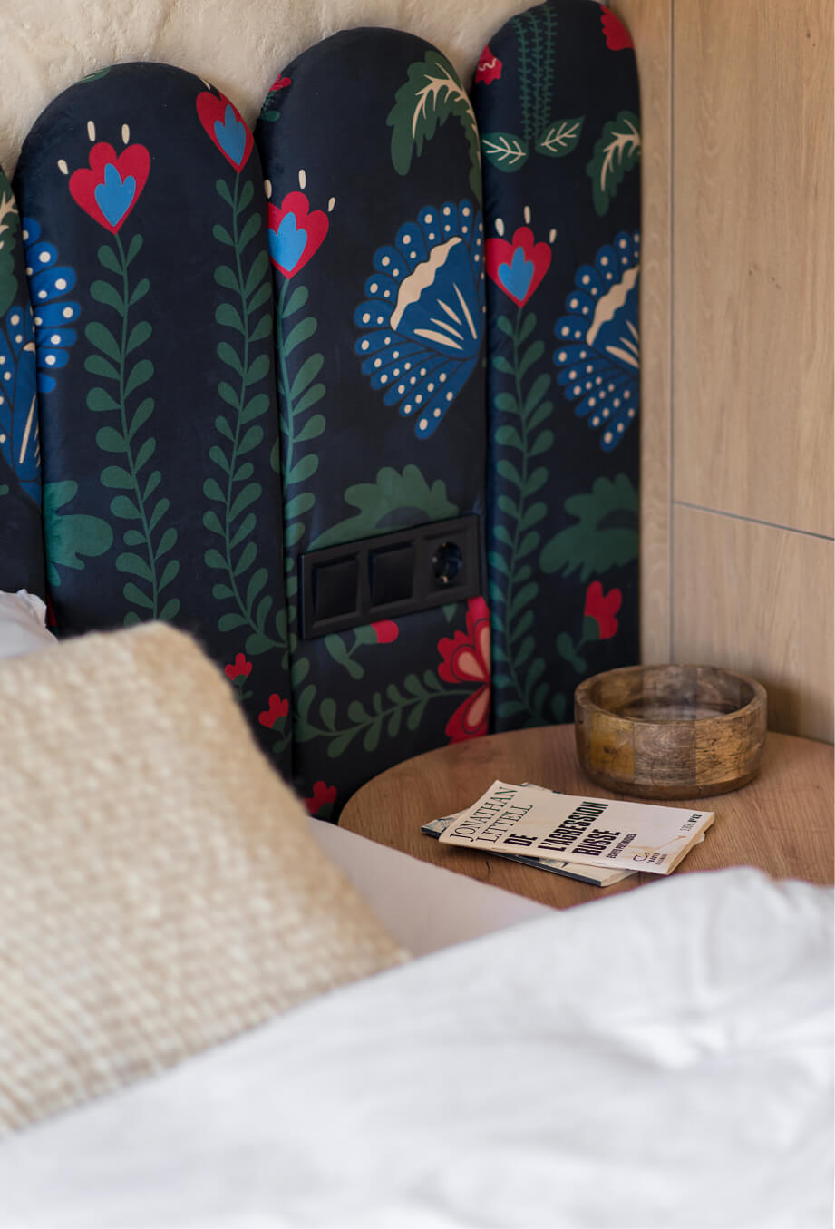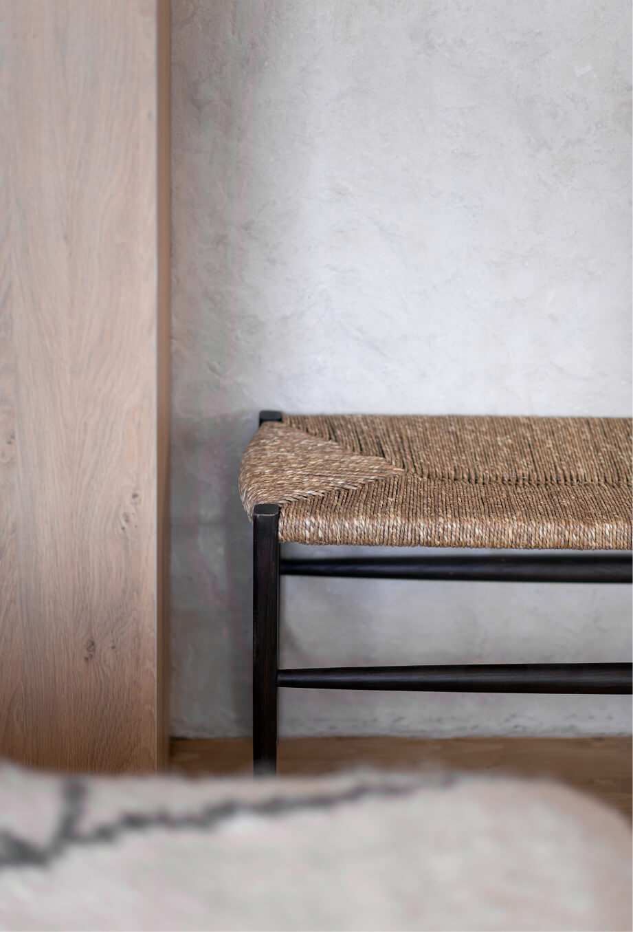 Спальня в Gont створена для відпочинку і відновлення. Двоспальні ліжка з дизайнерськими узголів'ями, шафи для речей, лавка FDB Møbler, вішалки, приліжкові столики, бра і штори забезпечують комфорт і функціональність. Для підсилення затишку ми обрали такі українські бренди домашнього декору, як подушки GUSHKA та килим Basny Rugs. У спальні відчувається безпека і спокій, особливо важливі в сучасних умовах.