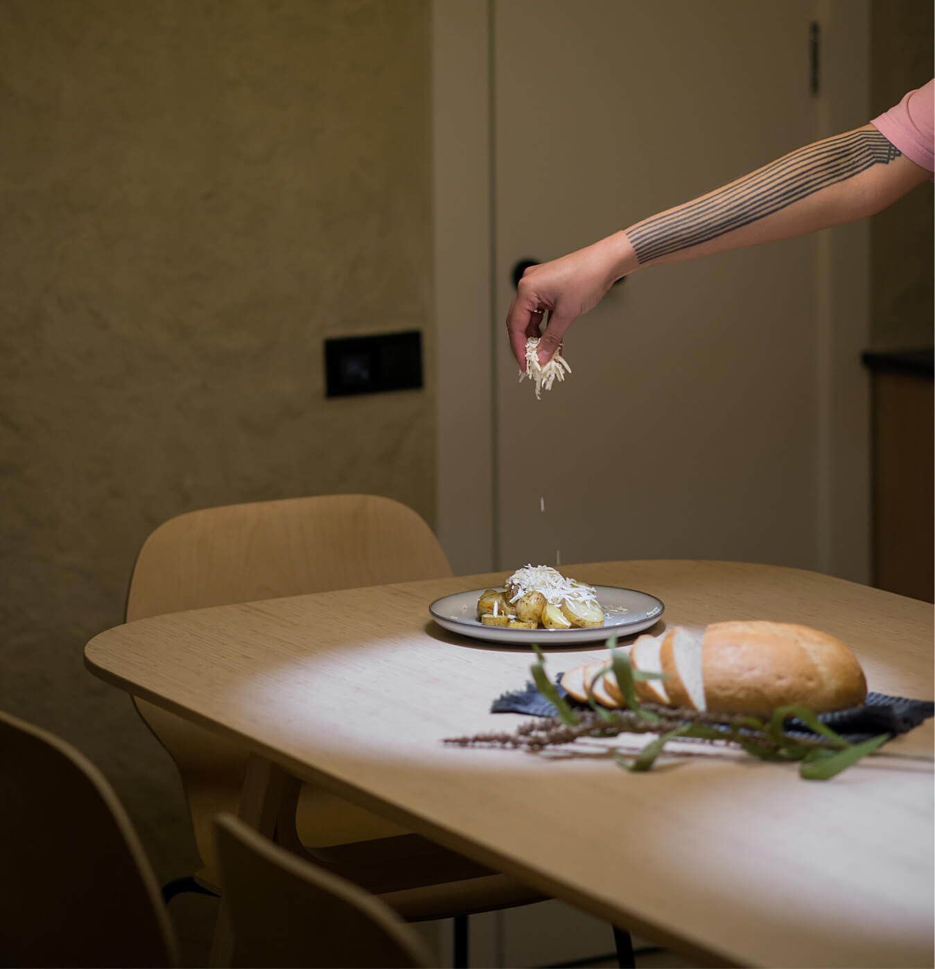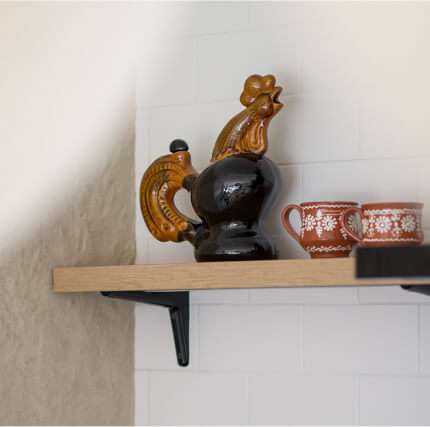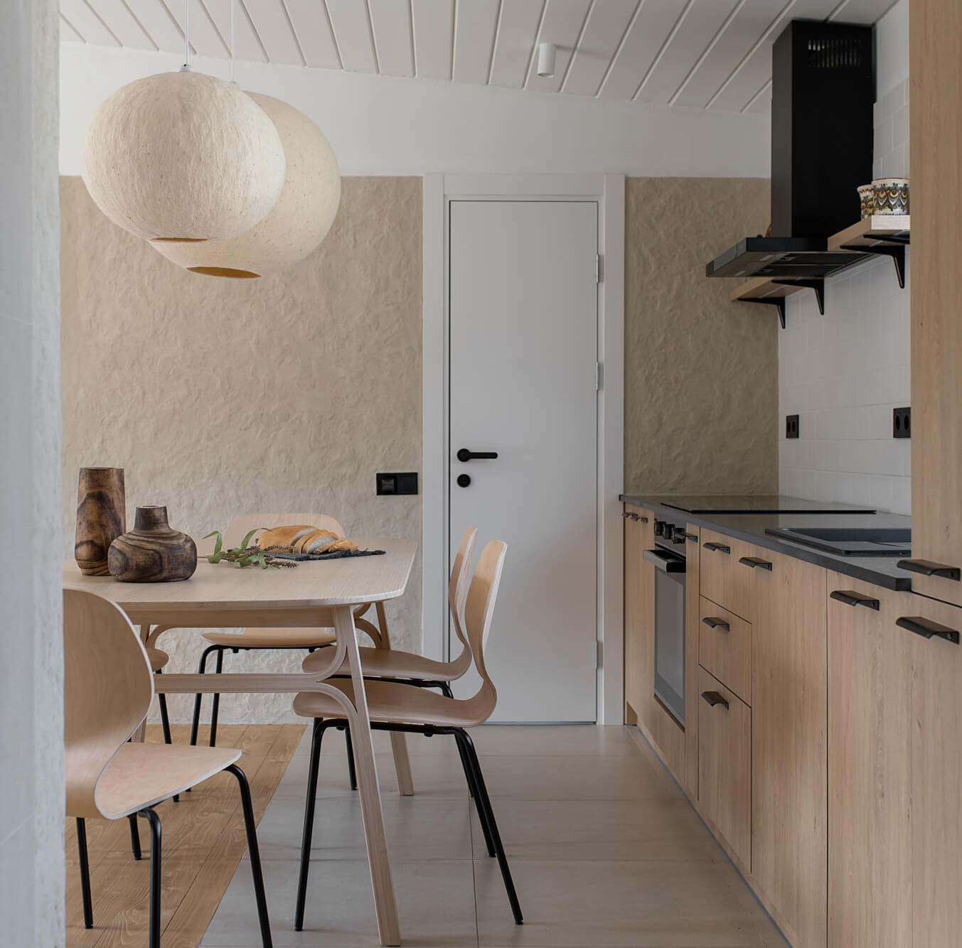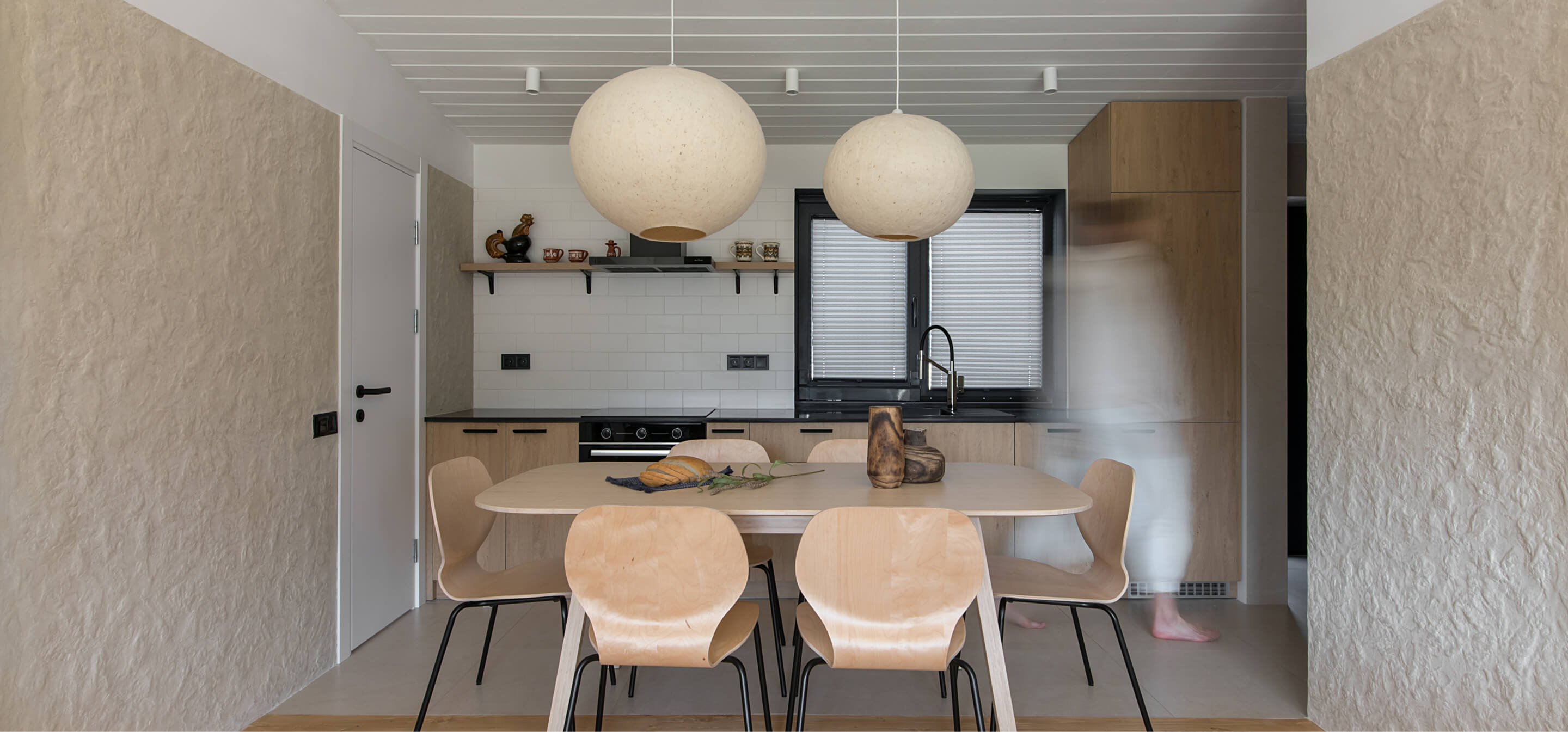 Кухня Gont поєднує функціональність і затишок. Стіл на шість осіб, вбудована кухня і широке вікно з видом на гори забезпечують простір для приємних моментів. Використані матеріали — дерево для підлоги та стелі, місцевий кварцит для стільниць, декоративна штукатурка українського виробництва на стінах, нанесена художником Ніколасом Муном. Світильники з овечої шерсті, які також є роботою вищезгаданого митця, є акцентом простору, додають унікальності і теплоти.