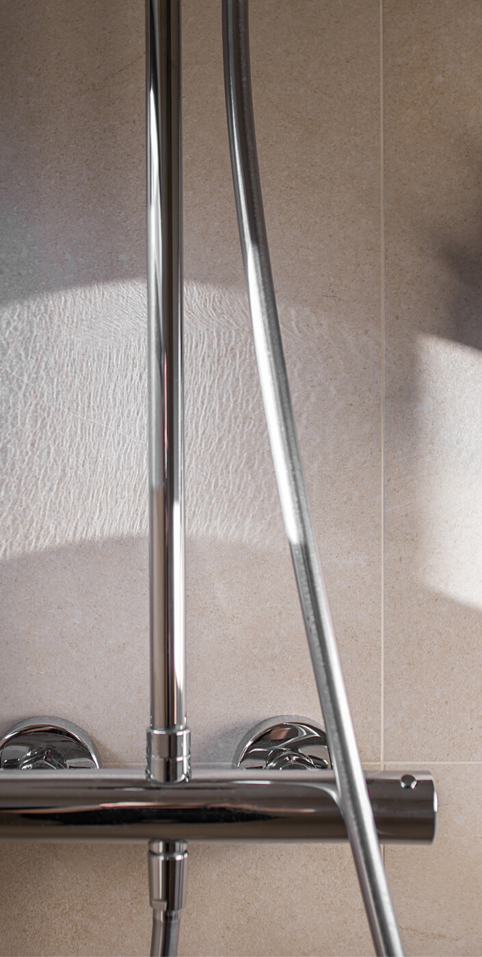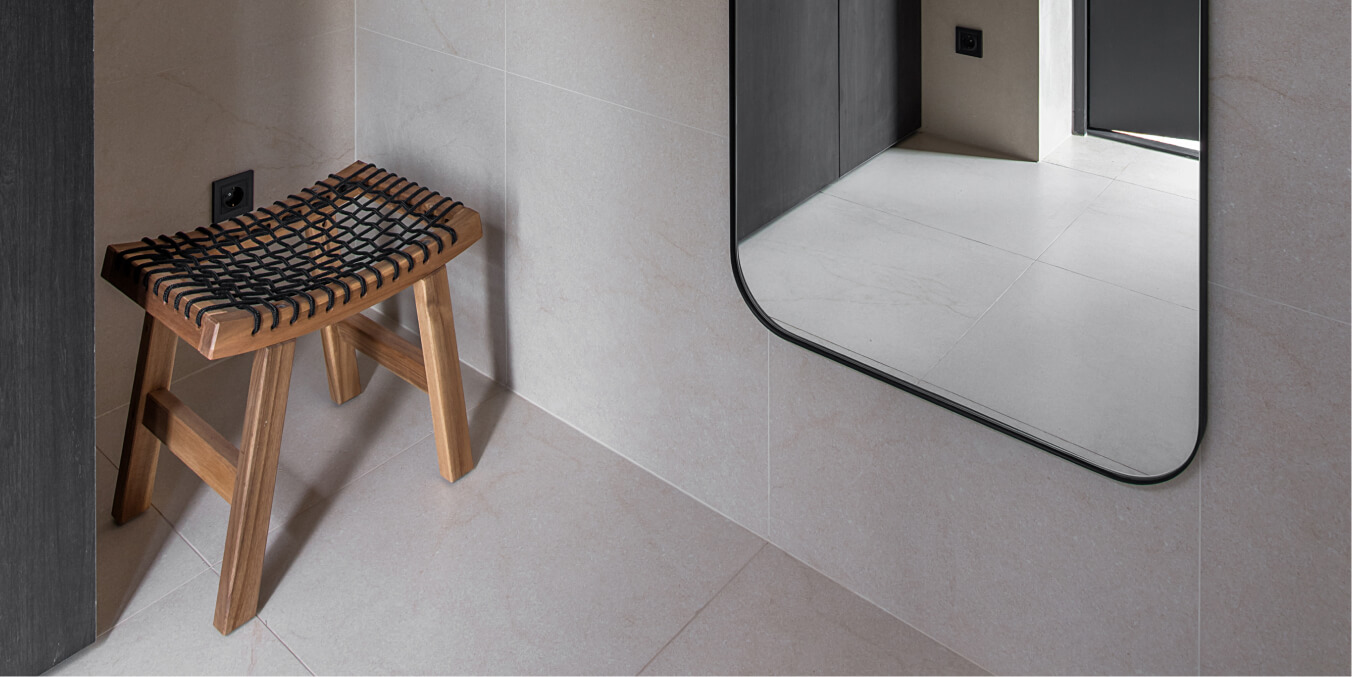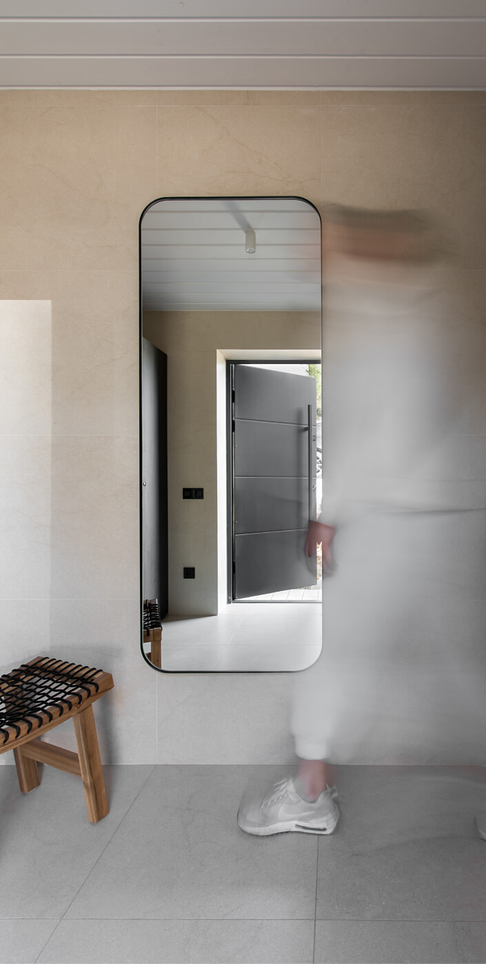 Вхідна зона Gont задає тон всьому інтер'єру. Велике дзеркало в повний зріст і функціональні шафи для верхнього одягу забезпечують практичність. Вхідні двері зі скляною вставкою впускають природне світло, створюючи відчуття простору та відкритості. Підлога та стіни вкриті керамічною плиткою, що додає витривалості, а дерев'яна фарбована вагонка на стелі підтримує загальну теплу атмосферу. Природні матеріали й теплі відтінки прихожої створюють відчуття запрошеності.