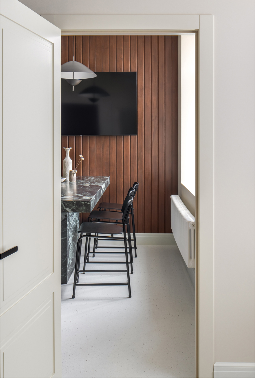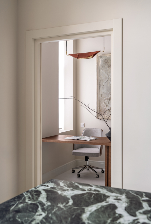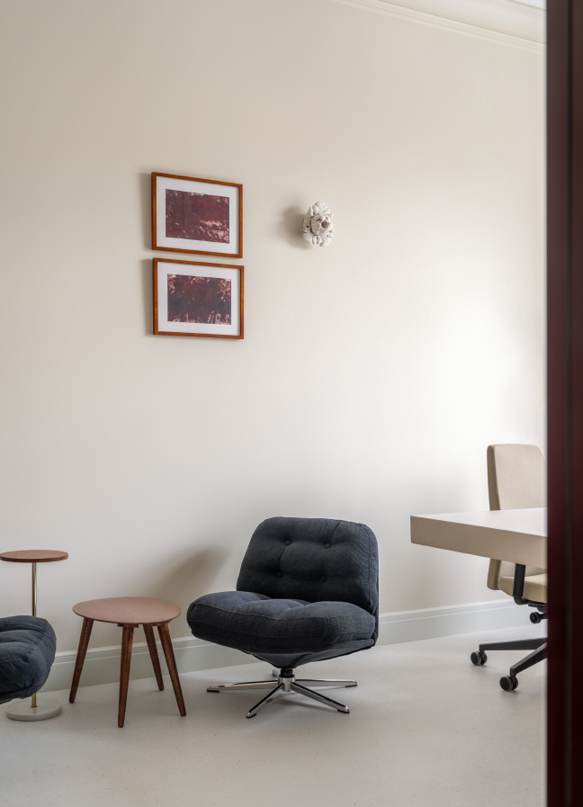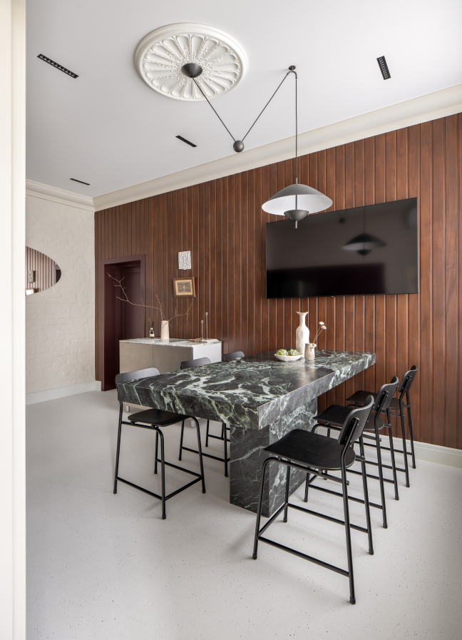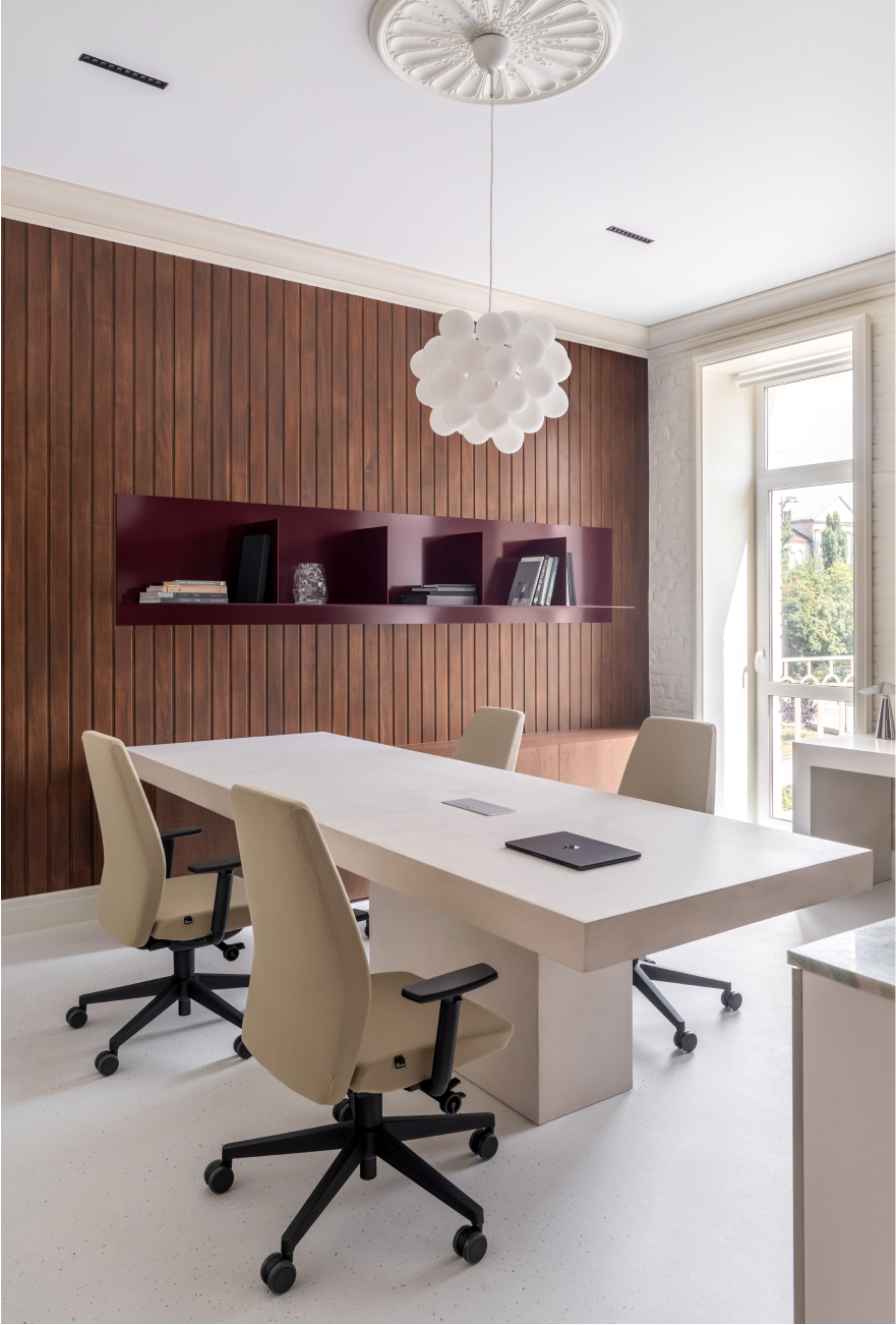 Чисті геометричні лінії меблів акцентують архітектурну довершеність простору, формуючи елегантний діалог форми й фактури. Використання єдиного матеріалу для столів та інших предметів інтер’єру забезпечує цілісність композиції. Декоративні молдинги, розетки й плінтуси відсилають до історичної спадщини будівлі, додаючи простору відчуття ґрунтовності. Вибір вінілового покриття Forbo не лише гарантує довговічність, а й забезпечує приємні тактильні відчуття при ходьбі.