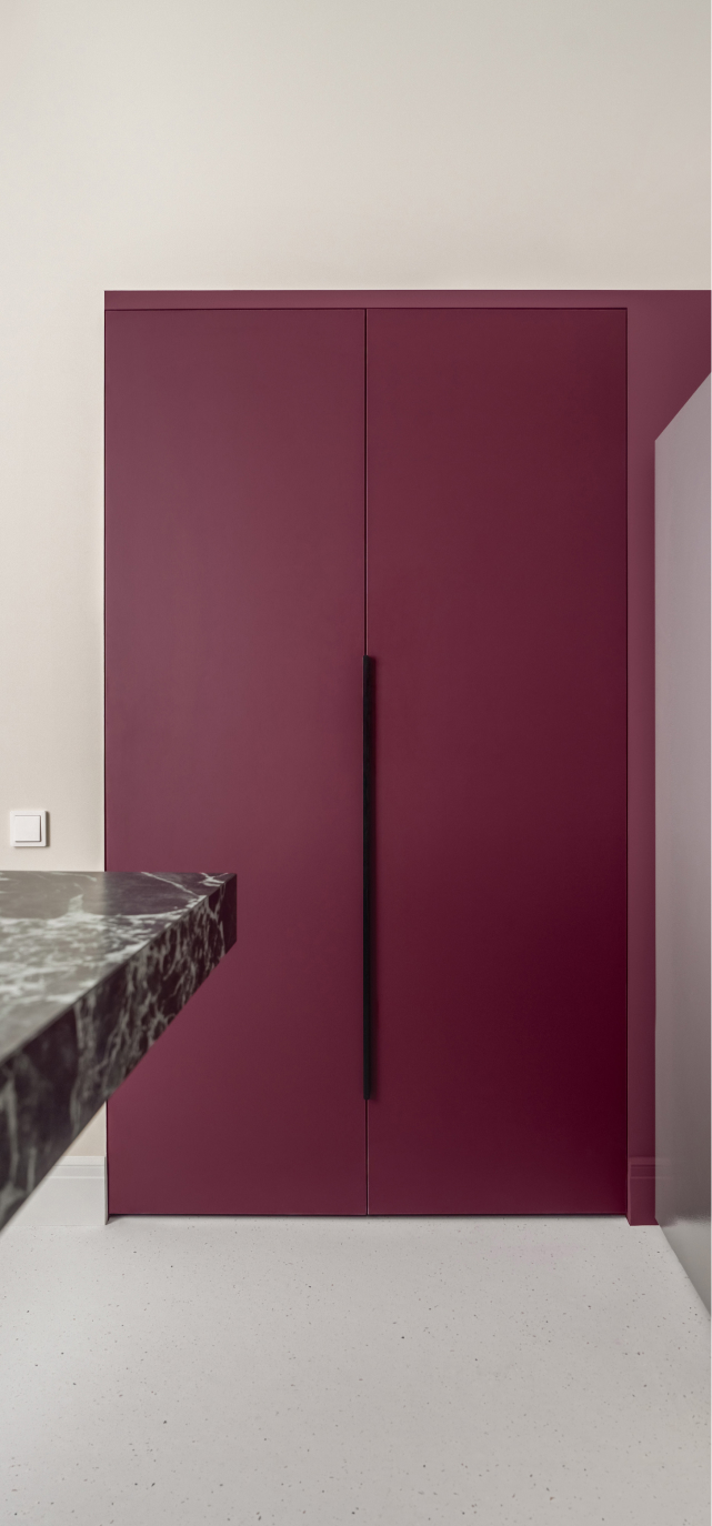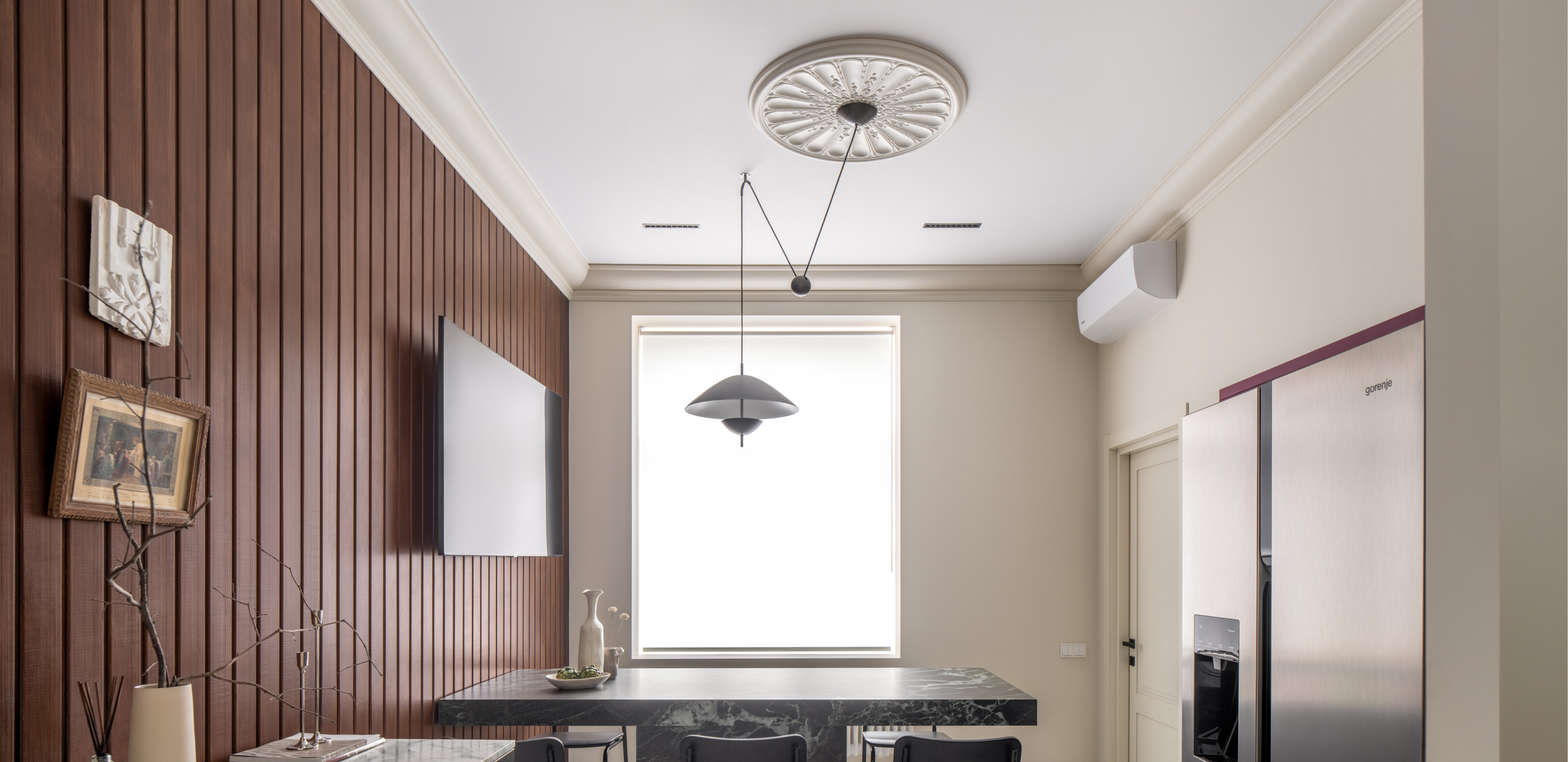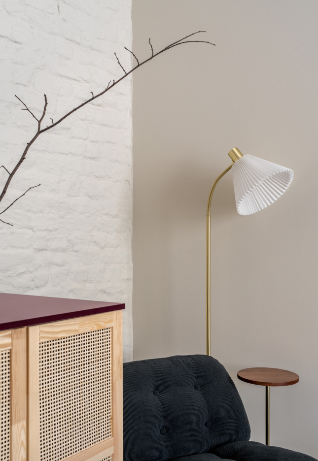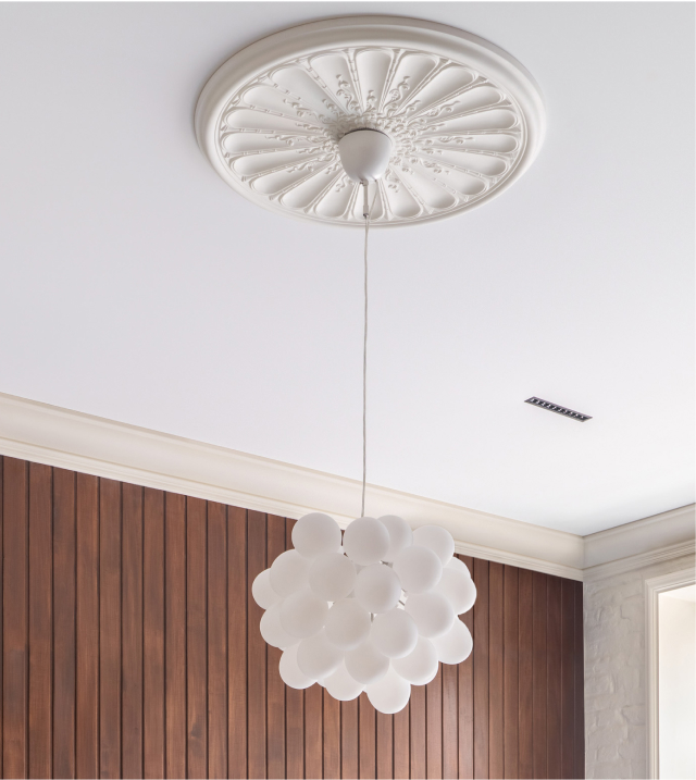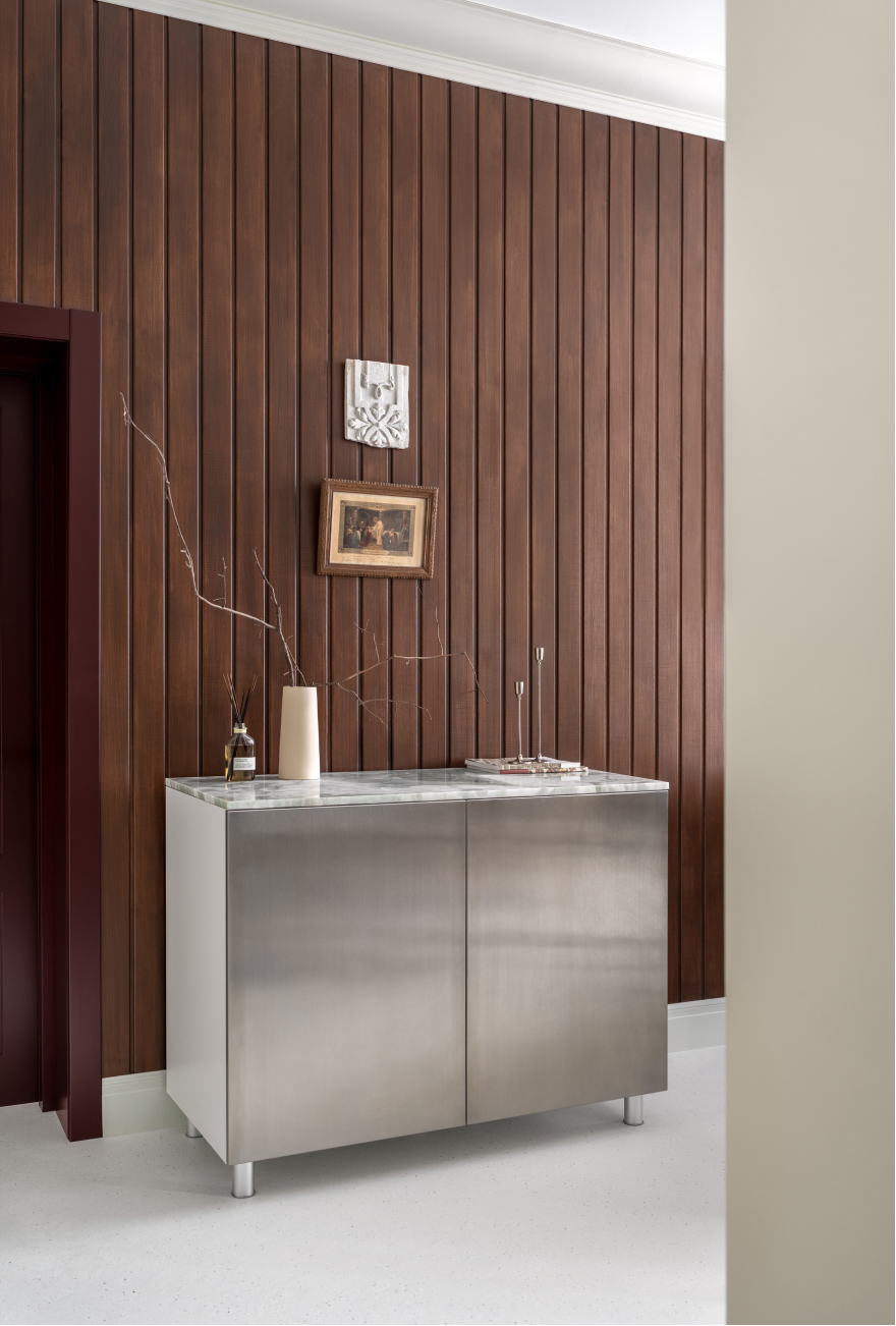Чисті геометричні лінії меблів акцентують архітектурну довершеність простору, формуючи елегантний діалог форми й фактури. Використання єдиного матеріалу для столів та інших предметів інтер’єру забезпечує цілісність композиції. Декоративні молдинги, розетки й плінтуси відсилають до історичної спадщини будівлі, додаючи простору відчуття ґрунтовності. Вибір вінілового покриття Forbo не лише гарантує довговічність, а й забезпечує приємні тактильні відчуття при ходьбі.