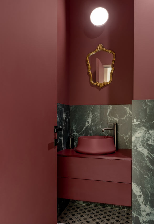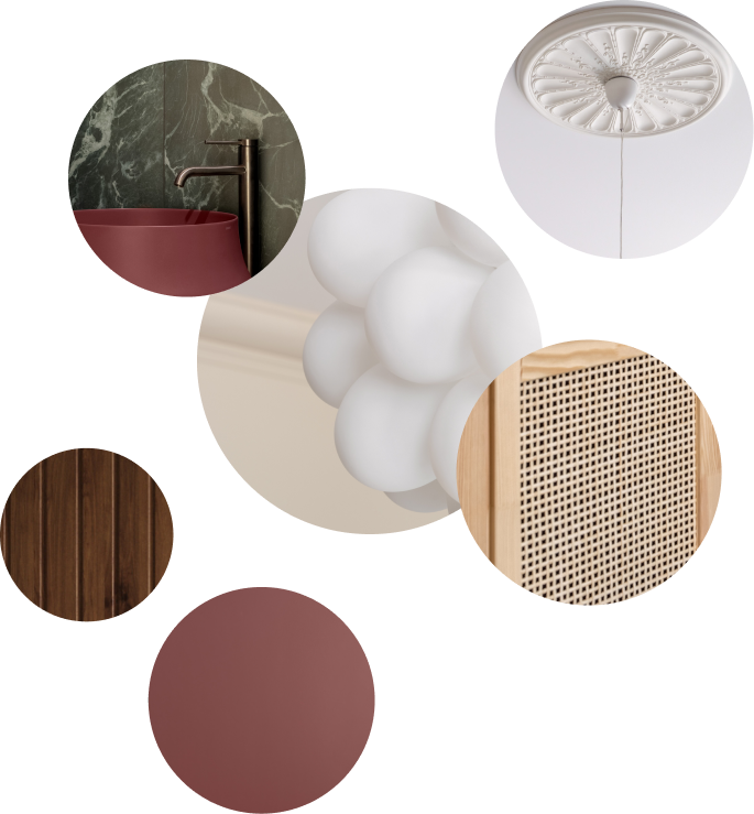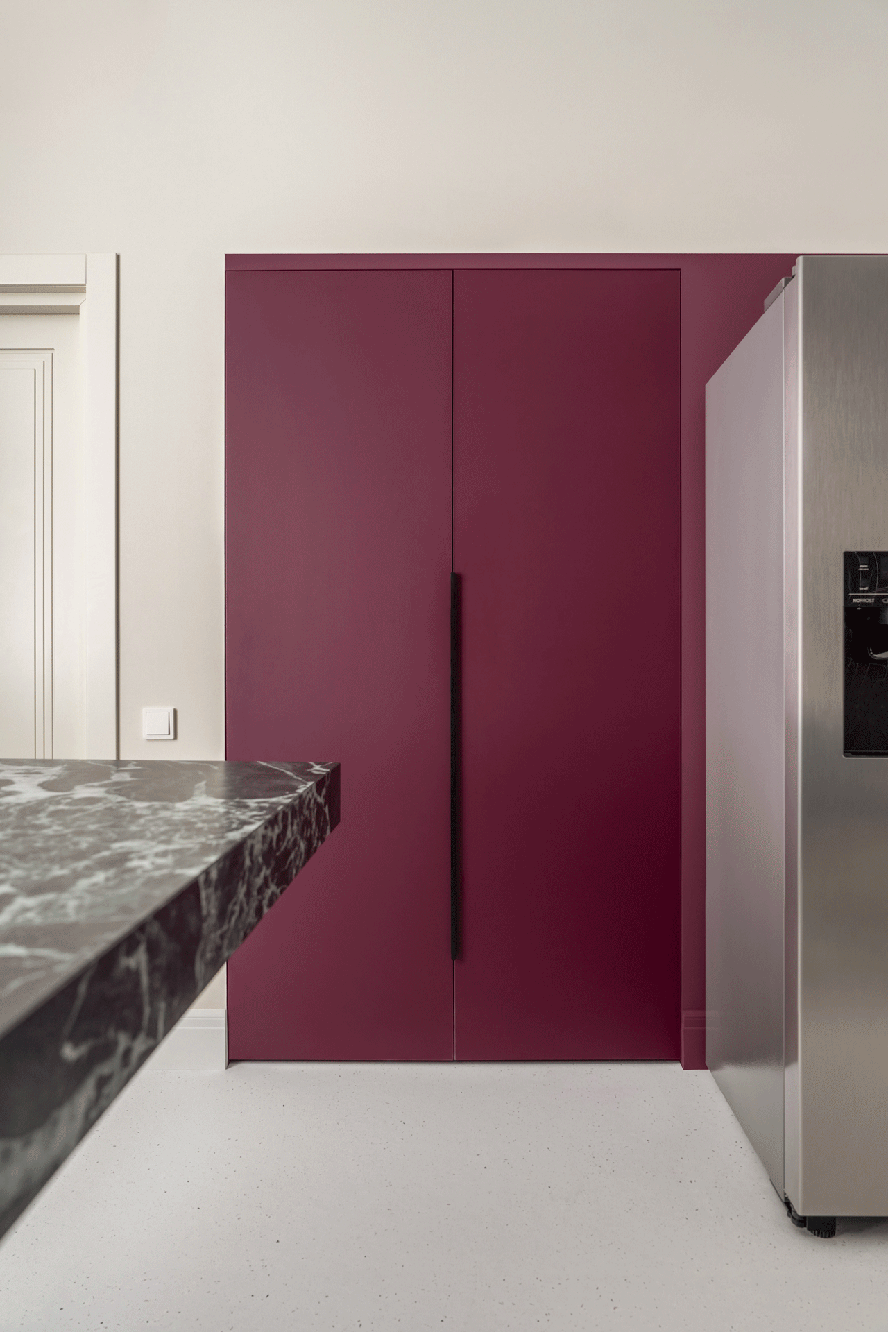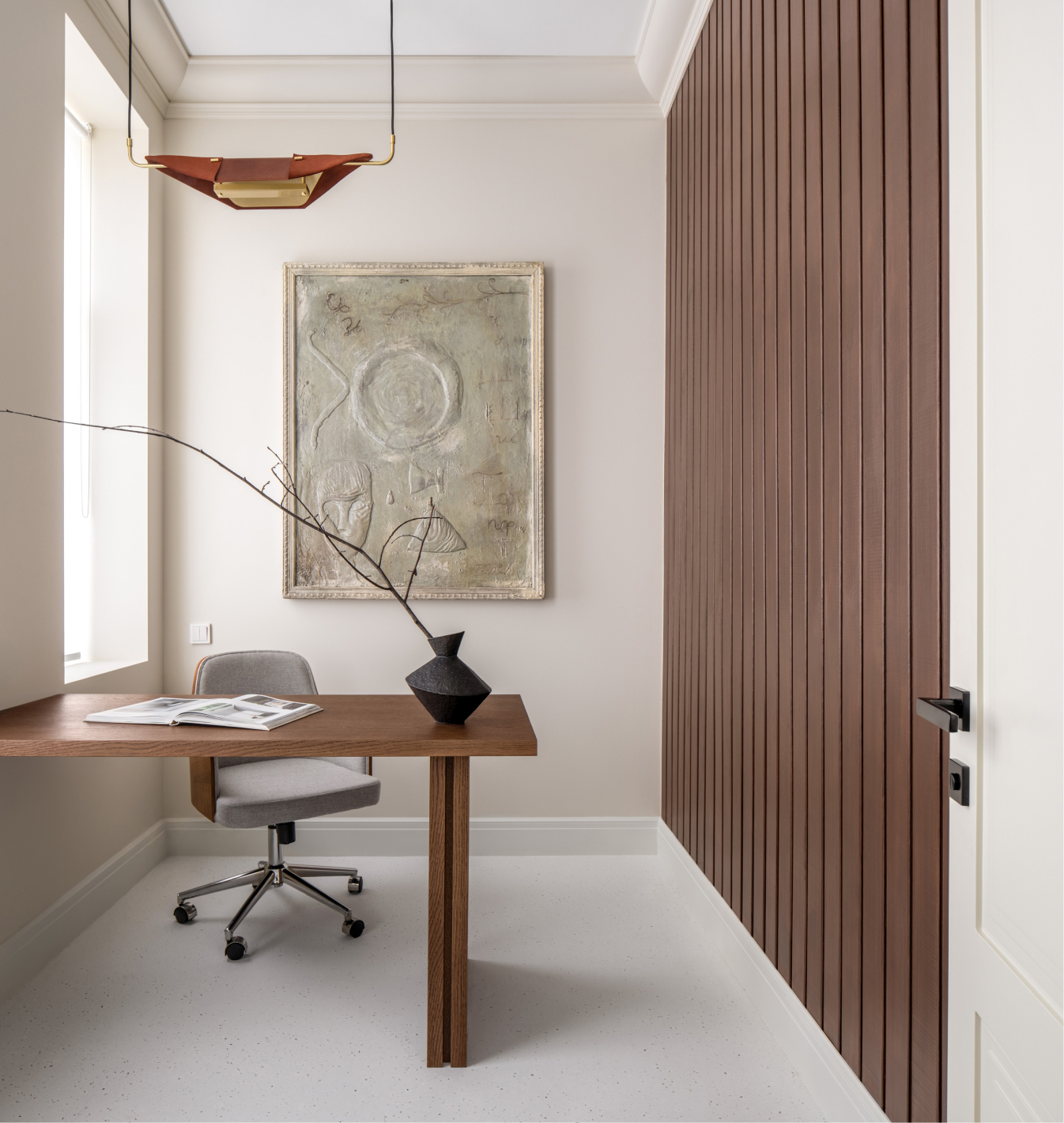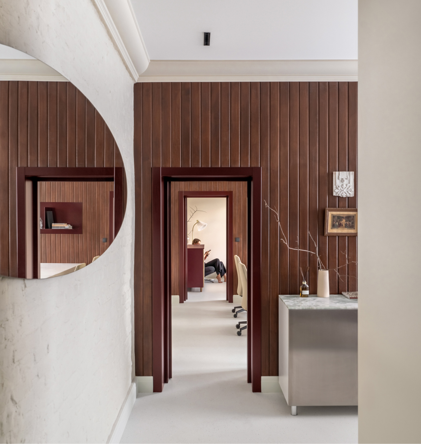 Чисті геометричні лінії меблів акцентують архітектурну довершеність простору, формуючи елегантний діалог форми й фактури. Використання єдиного матеріалу для столів та інших предметів інтер’єру забезпечує цілісність композиції. Декоративні молдинги, розетки й плінтуси відсилають до історичної спадщини будівлі, додаючи простору відчуття ґрунтовності. Вибір вінілового покриття Forbo не лише гарантує довговічність, а й забезпечує приємні тактильні відчуття при ходьбі.