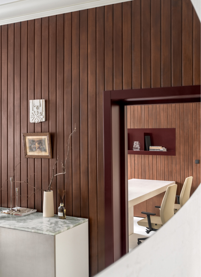 Натхненний культовим серіалом "Твін Пікс", дизайн офісу зосереджений навколо знакових дерев'яних панелей, що відсилають до поліцейського відділку з шоу. Цей мотив став основою естетики простору, наповнюючи його теплотою натуральних матеріалів та створюючи тонкий баланс між стриманістю й затишком. Доповнюючи дерев’яні елементи, плитка WOW у головній зоні створює гармонійний візуальний контраст, підкреслюючи гру текстур у всьому інтер’єрі.