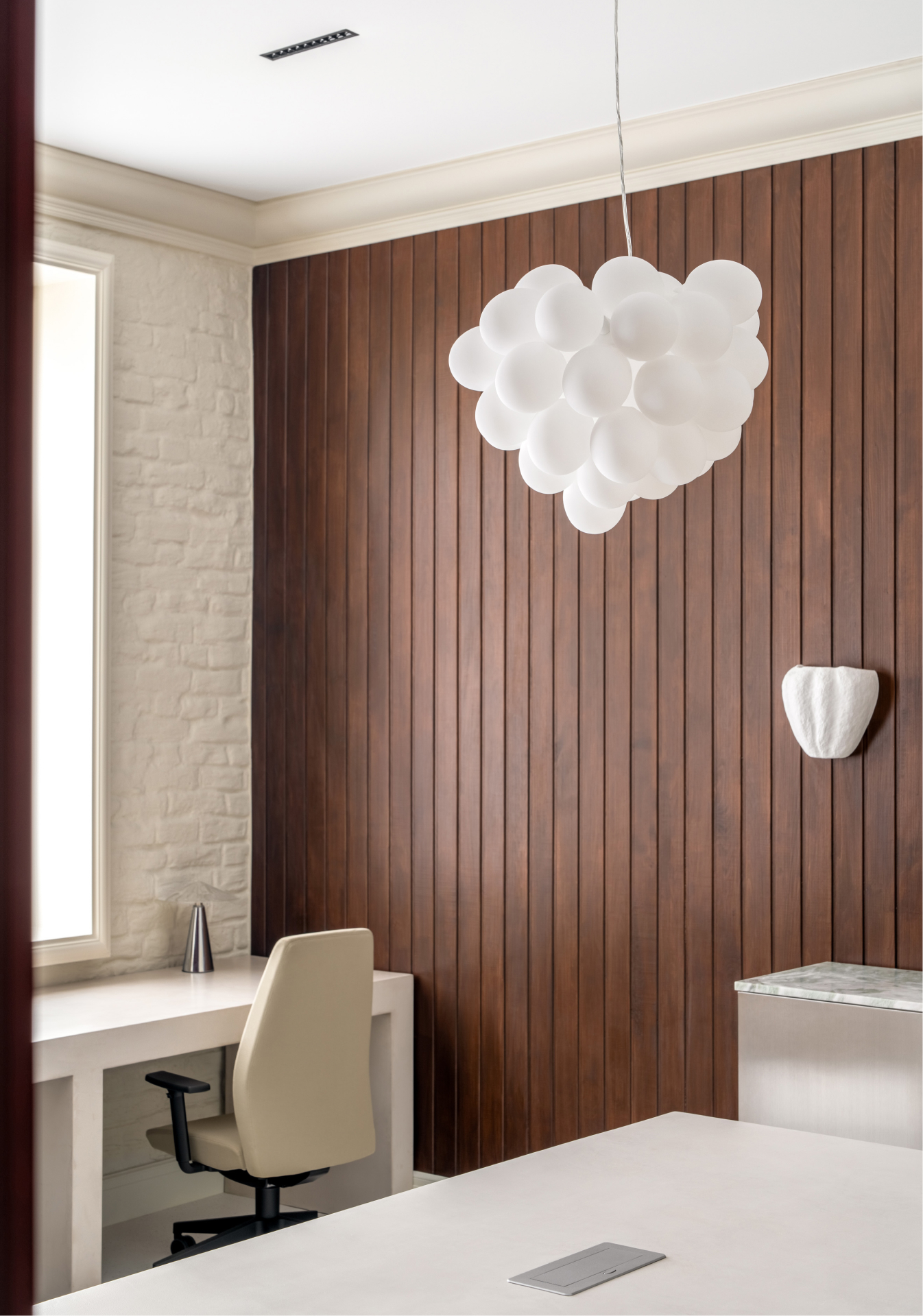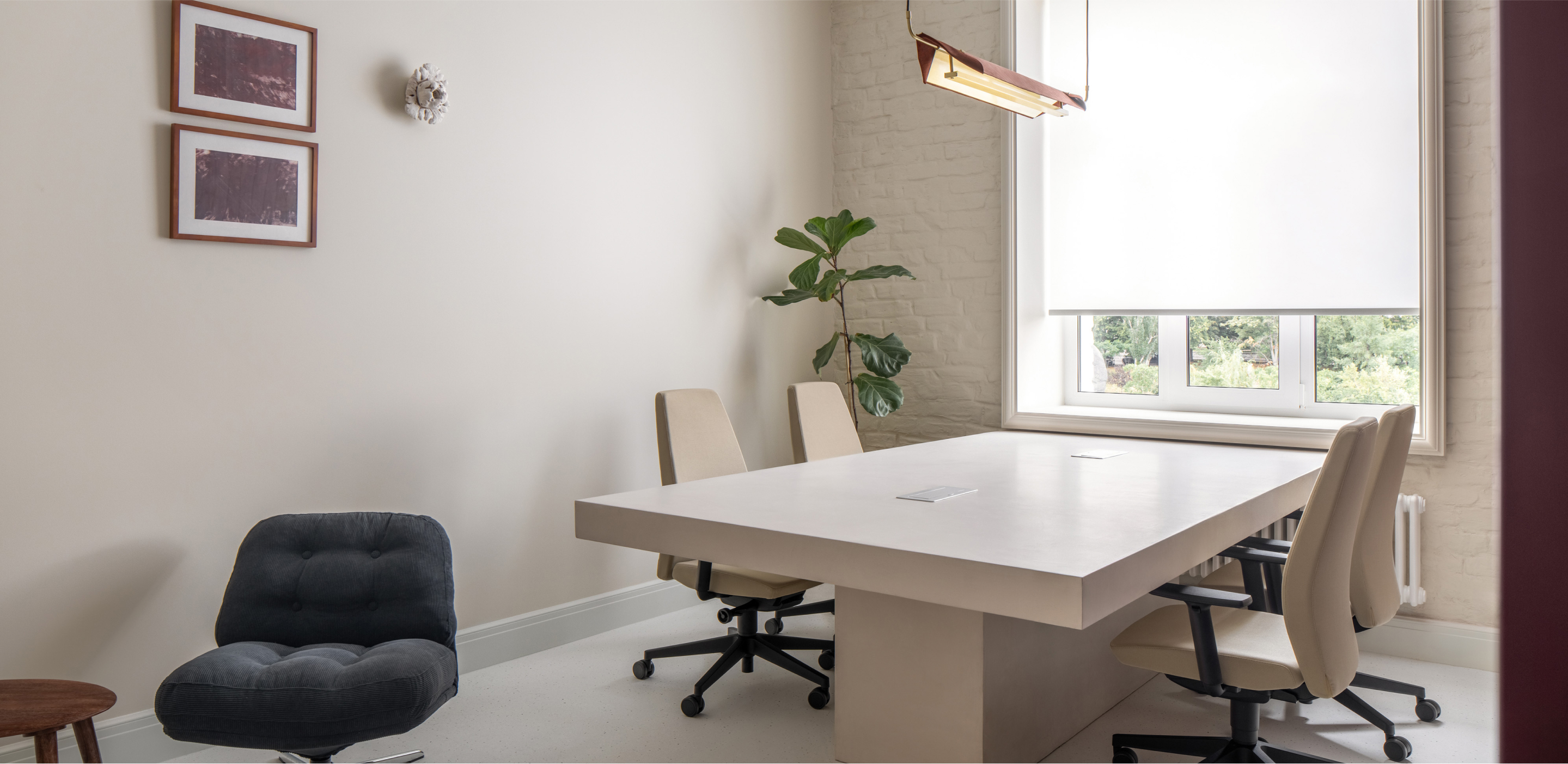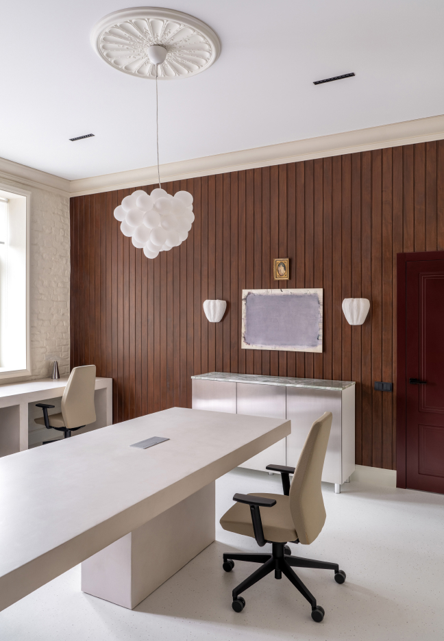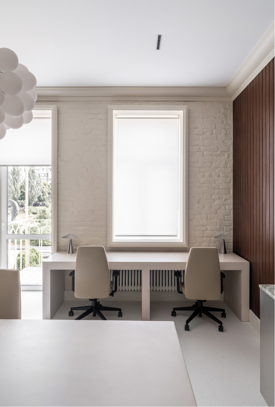 Офіс є втіленням гармонійного поєднання сучасності та традицій, створюючи простір, що сприяє як продуктивній роботі, так і творчому натхненню. Кремові відтінки стін і тонкий рельєф оштукатуреної цегли формують спокійну атмосферу, де кожна деталь випромінює комфорт і стиль. Вишукані крісла Sancrea та барні стільці PRO PRO підкреслюють загальну концепцію офісу, де простота й розкіш поєднуються, створюючи відчуття балансу.