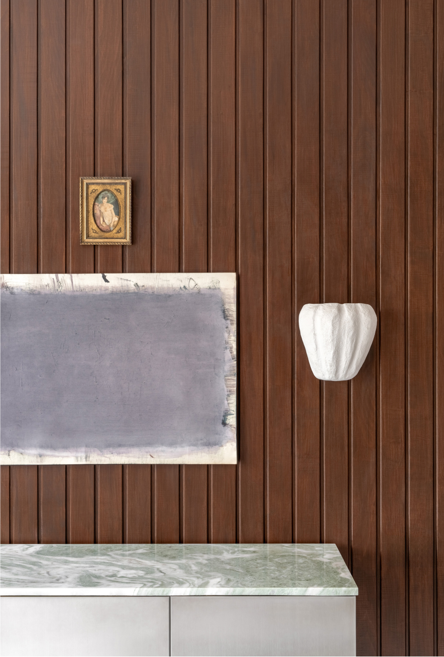 Віртуозна гра текстур у VV126 поєднує прохолодну витонченість мармуру та нержавіючої сталі з теплою основою деревини. Це зіставлення підсилює відчуття елегантності та розкоші. У головній зоні центральним акцентом став ефектний підвісний світильник Rydens, що додає вишуканості й завершеності загальному образу простору.